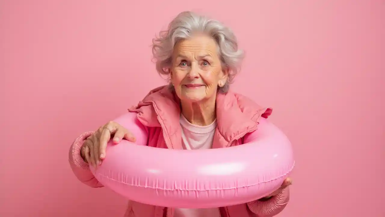 Mulheres bonitas usando um rosa com um anel inflável rosa, isolado em um fundo rosa