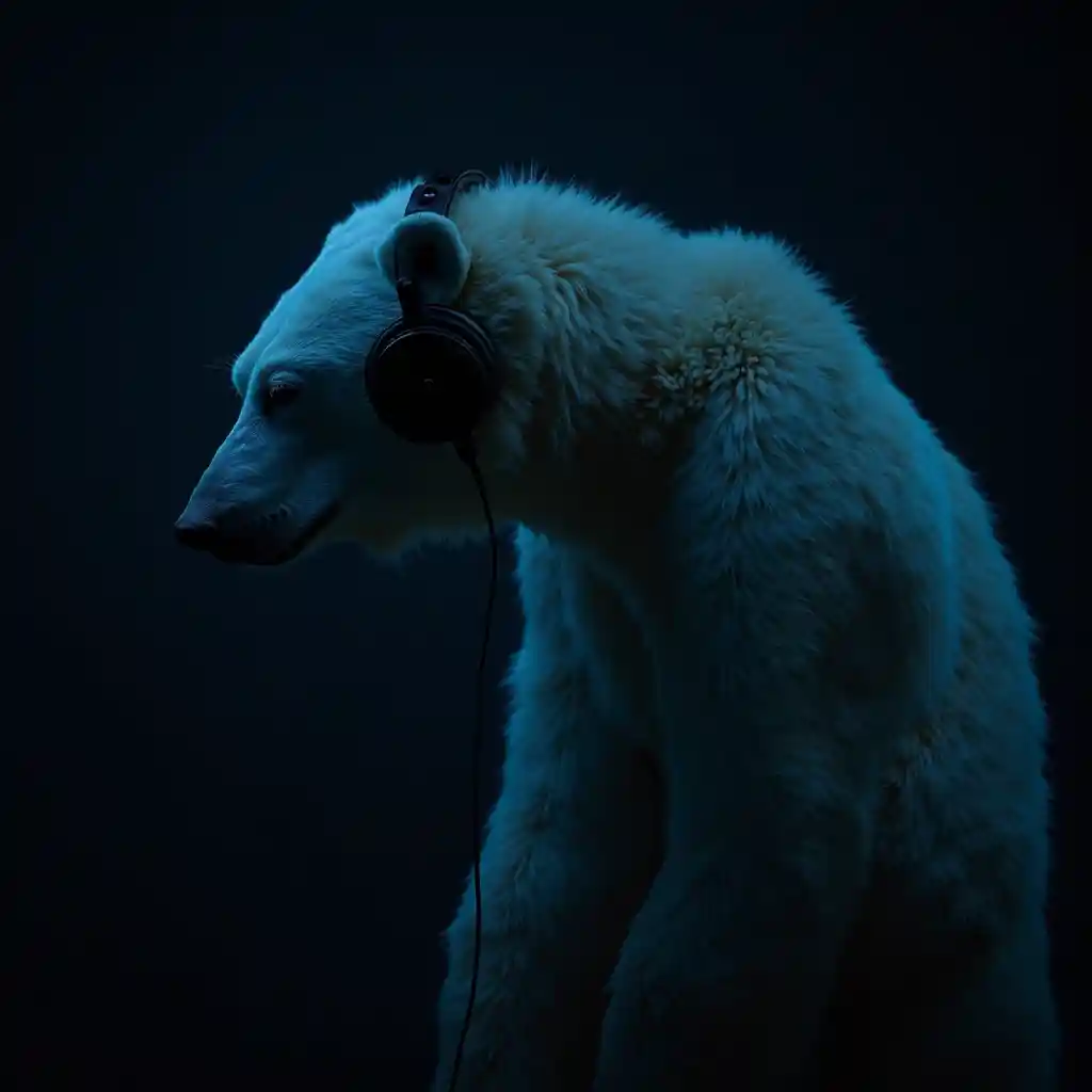 JaxonUm retrato escuro de um urso polar desnutrido em perfil usando fones de ouvido olhando para baixo sombrio com os olhos fechados. Foto real. Iluminação de estúdio azul e sutil