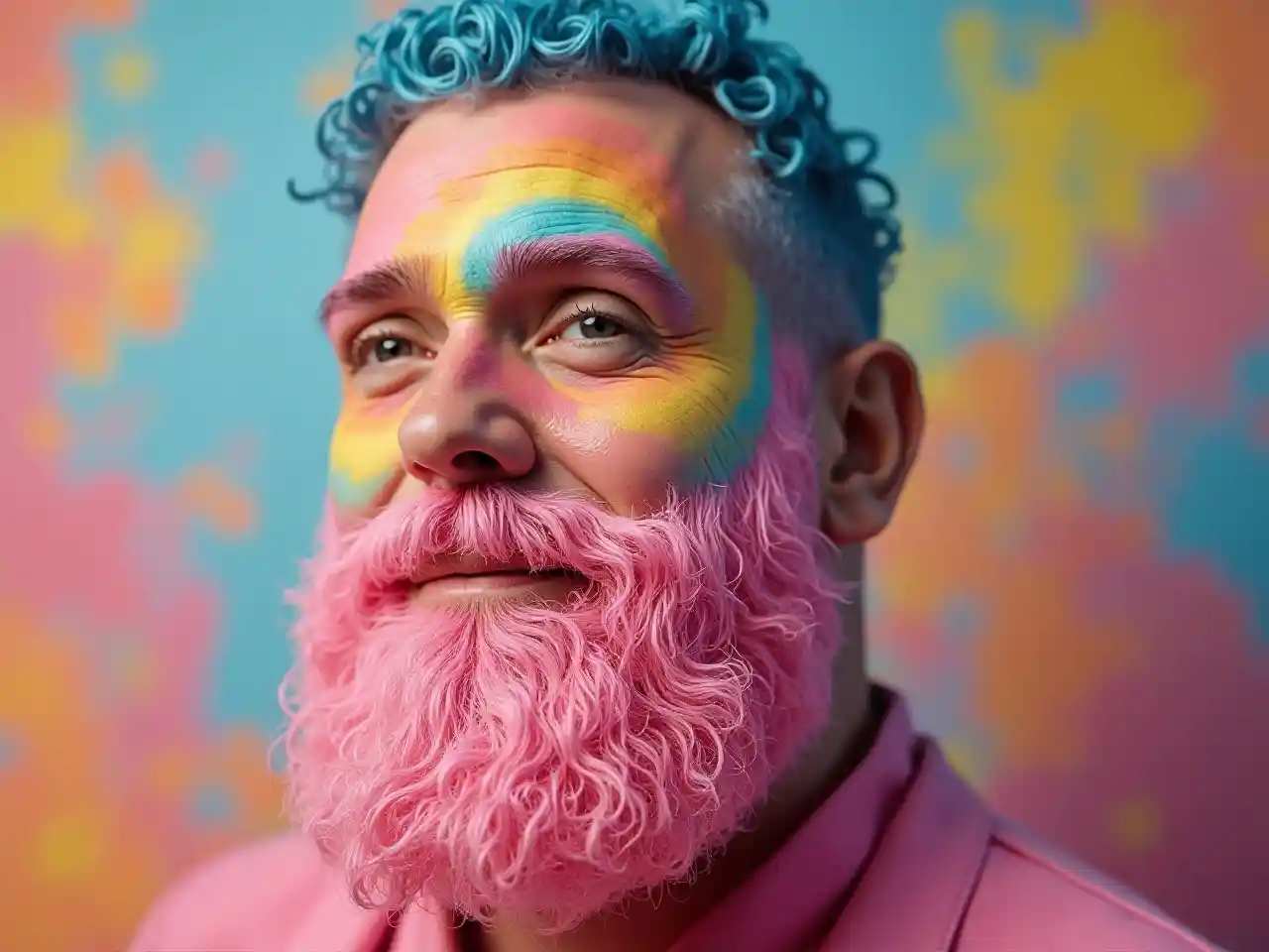 Maquiagem de arco-íris, fundo colorido, barba rosa