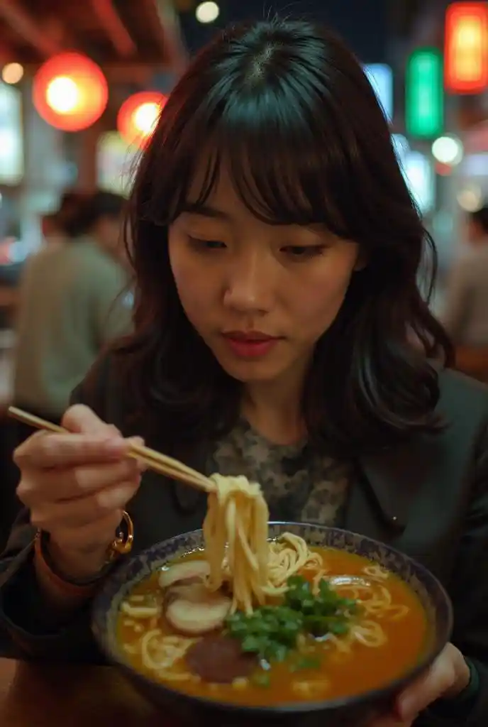JaceUm close-up de uma japonesa de cabelos escuros na casa dos vinte, desfrutando de uma tigela de ramen Hakata Tonkotsu, de aparência deliciosa, num bar Hakata, pouco iluminado e movimentado