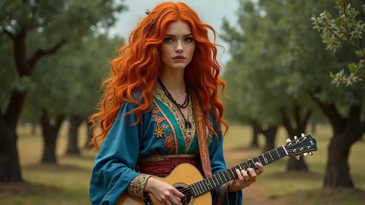 Uma deusa ruiva, a tocar guitarra, olival, psicodélico, roupão azul.