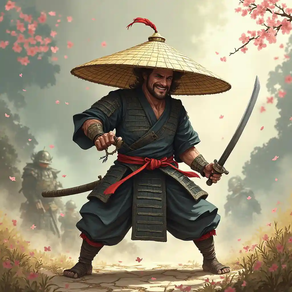 Subject: Samyray Shogun, a comically brave and quirky samurai warrior, ready to battle invisible foes and his own fears Character Description: Samyray Shogun is dressed in exaggerated, traditional samurai armor, but with a comical, light-hearted twist. He wears an oversized Japanese straw hat (kasa) that almost covers his face, adding to the humor. His facial expression shows a mix of exaggerated bravery and slight fear, as if unsure whether he’s truly prepared to face invisible enemies. Pose: Samyray Shogun stands in an exaggerated fighting stance, with his sword raised high in a dramatic but humorous pose, swinging wildly at unseen opponents. His movements are exaggerated, making it clear that his invisible enemies and fears are as much in his mind as on the battlefield. Setting/Background: A stylized, mystical Japanese battlefield with swirling mist and cherry blossoms falling in the background. The enemies are invisible, represented by swirling winds or subtle, abstract shapes, giving a sense of unseen threats. Lighting: Soft, mystical lighting that highlights Samyray’s exaggerated features and stance, casting humorous shadows as he fights his invisible foes. Additional Elements: The scene is filled with humorous details, such as Samyray’s sword occasionally missing the mark, and his hat slipping down over his eyes. In the background, faint hints of exaggerated "fears" are seen, like over-the-top shadowy figures or exaggerated monsters, reinforcing the humor of his imaginary battle.