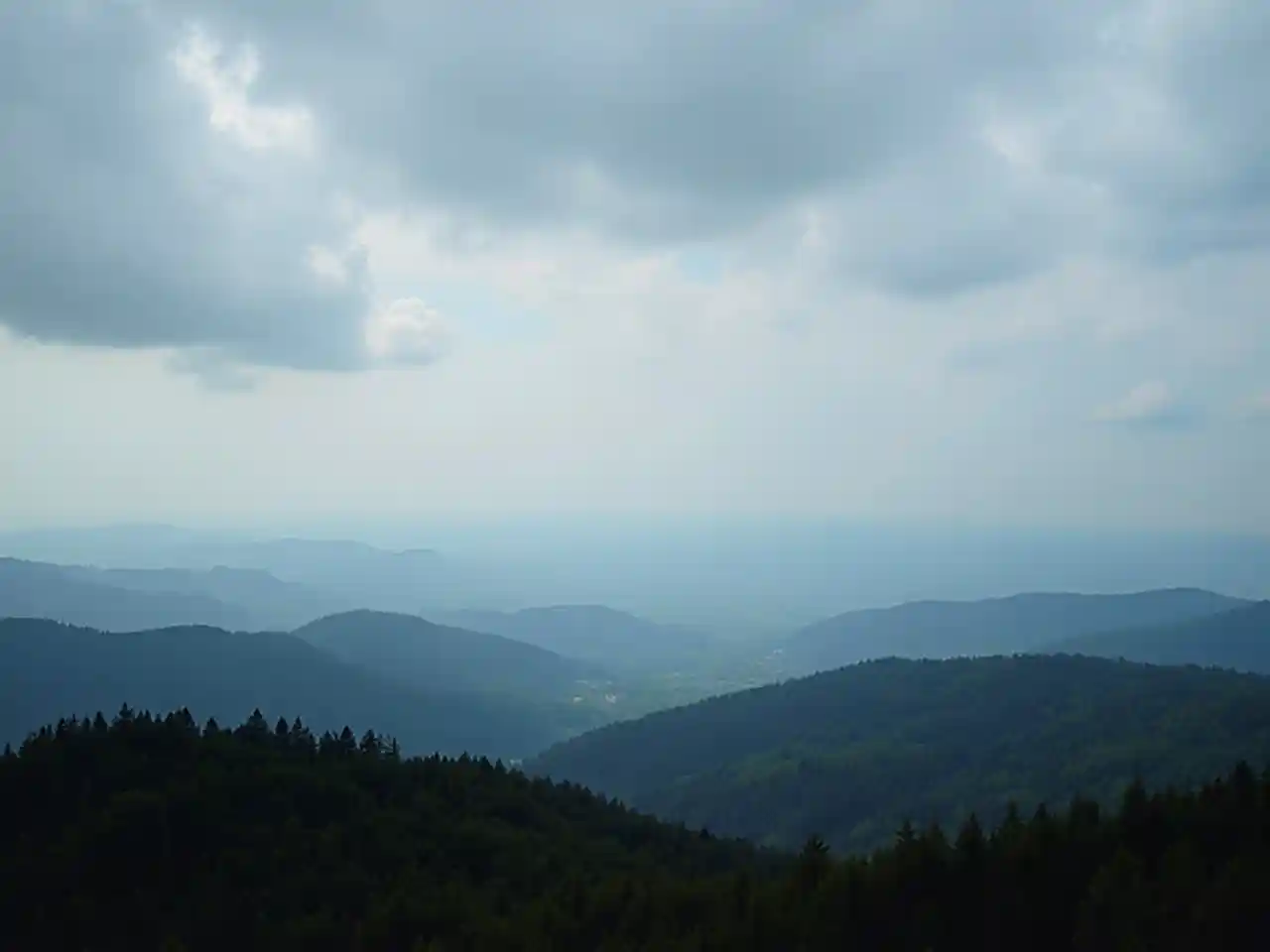 uma paisagem com colinas, árvores, um céu azul nublado, horizonte baixo,