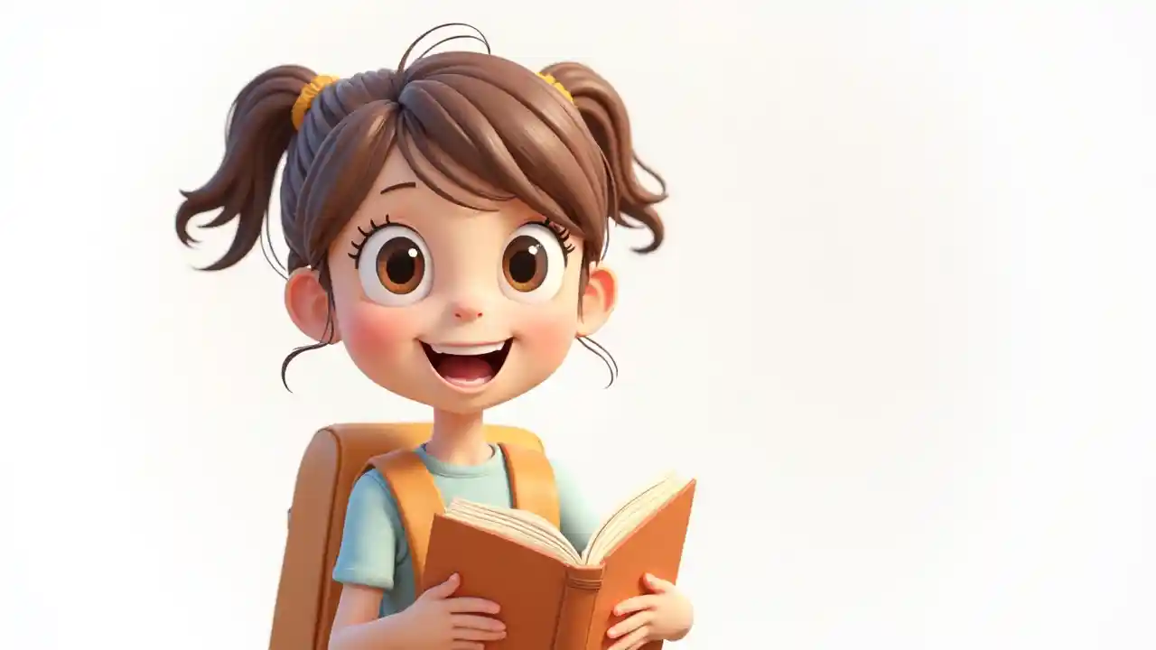 Jamesmenina na escola com um livro, sorridente, engraçada, olhos grandes, estilo de desenho animado 3D, roupas alegres, mochila, estilo Pixars, estilo Disney, giro, fundo transparente