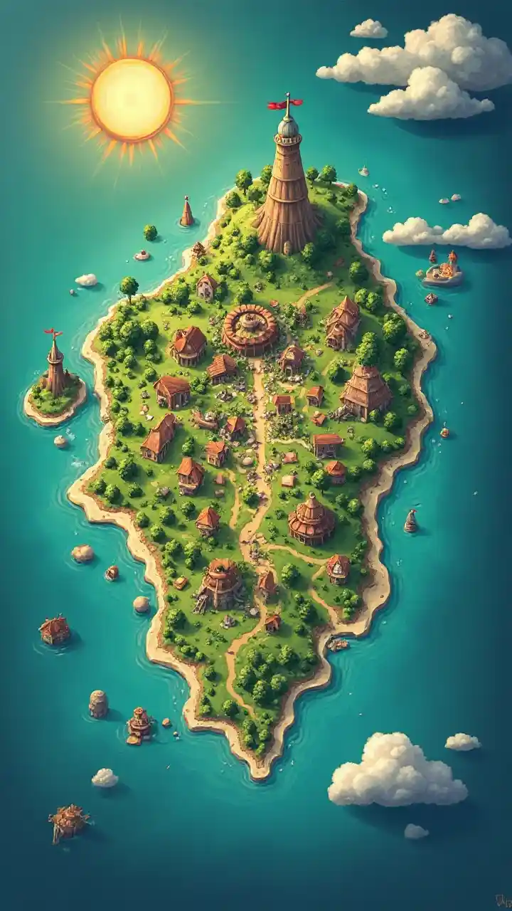 VictoriaUm mapa de um reino chamado de sidra numa ilha, nenhum mapa deve ter uma cidade principal escrita capital, lojas ao redor do globo, um sol riscado no canto, faça o mapa bem escuro