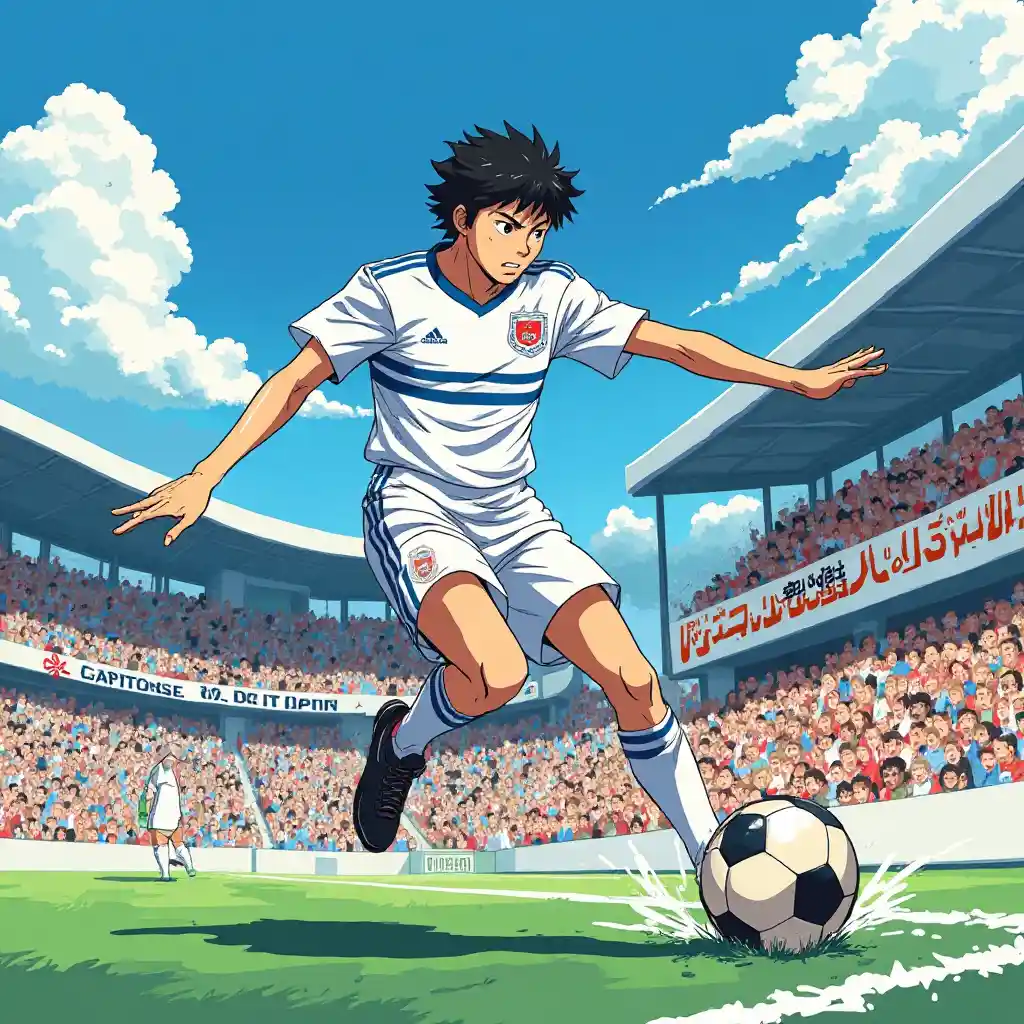 Desenhe um gráfico impactante que celebre o espírito energético do futebol, inspirado no icónico anime "Captain Tsubasa". No centro, um jogador de futebol dinâmico, de uniforme branco com listras azuis, capturado no meio da ação, a chutar uma bola de futebol com uma força incrível. Destaque as linhas de movimento para enfatizar a velocidade e o movimento, criando uma sensação de intensidade e foco. Cerque o jogador com um cenário vivido de estádio, cheio de fãs entusiasmados sob um céu azul, simbolizando a unidade e a emoção do esporte. Incorpore uma sobreposição de texto japonês ousada que complementa a estética animada, mostrando o significado cultural do futebol no Japão. Use uma paleta de cores marcantes para chamar a atenção e tornar o gráfico visualmente inesquecível.