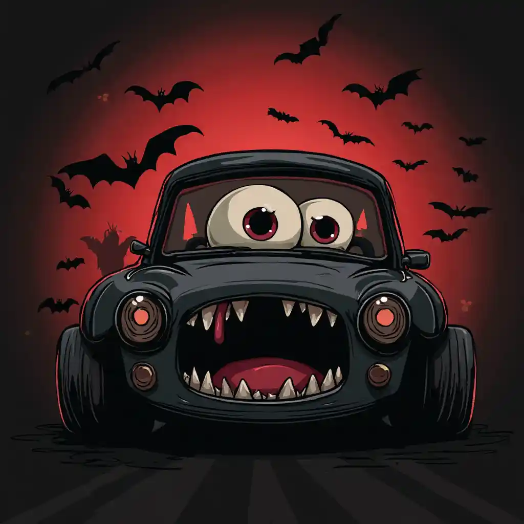 Carro assustador, dentes de vampiro, olhos redondos, preto, fundo de morcego,