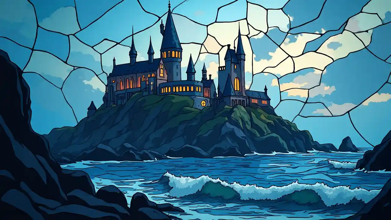 Ethanestilo vidro com formas geométricas do castelo de Hogwarts no fundo rodeado de fresco O céu e os penhascos rochosos sobre o mar frio.