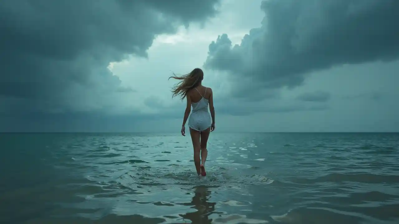 Ela anda descalça na superfície da água sob um céu tempestuoso.