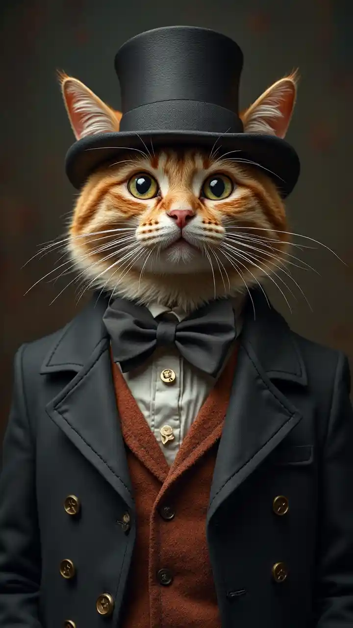 Um Gato Hiper-Realista Vestido com Veste e Chapéu
