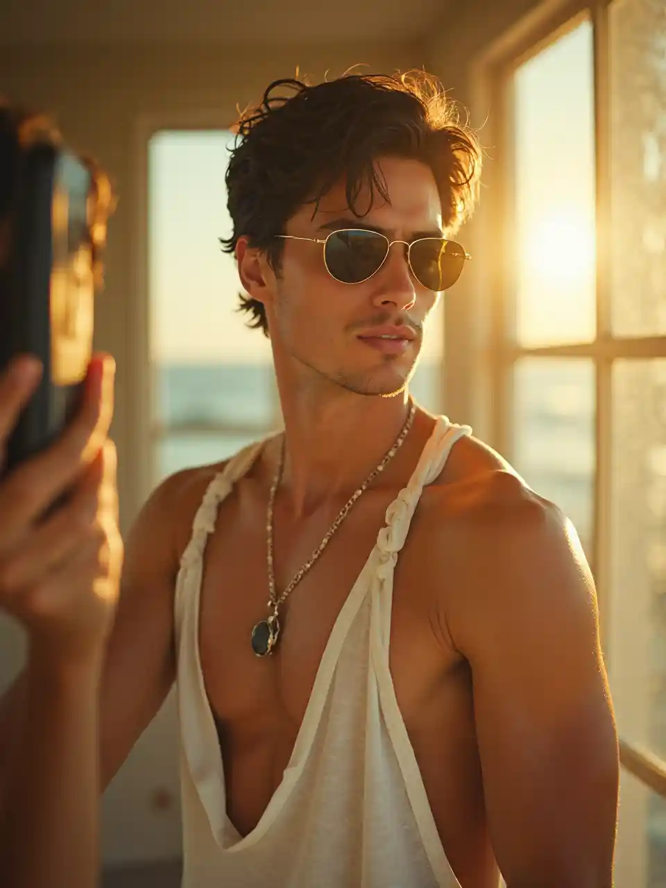 Foto hiper-realista de um homem atraente usando roupas de praia e óculos de sol, capturado num espelho com o último smartphone. Ele tem cabelos curtos e escuros e está em pé em um quarto brilhante e convidativo. A imagem apresenta um grão de filme quente que lembra o Kodak Portra 800, com uma profundidade de campo de f1,8, banhada no brilho suave da hora dourado, evocando uma sensação de elegância casual e relaxamento de verão.