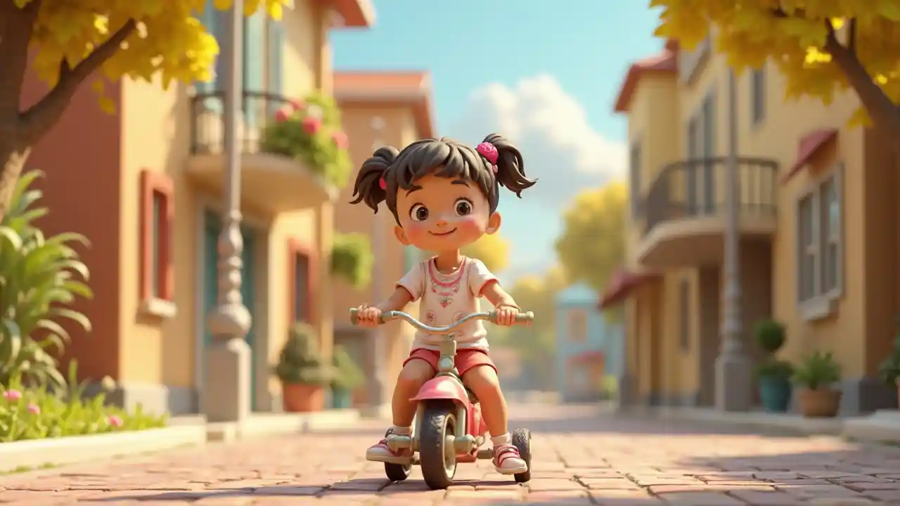 Uma encantadora menina de seis anos de idade anda de triciclo por uma pitoresca rua num dia brilhante. A cena foi feita em impressionante arte 3D, usando C4D e Octane Render com rastreamento de raios avançados. O triciclo e o ambiente são feitos com um acabamento de material de barro, que lembra os objetos de colecção da Popmart. A estética empresta do estilo caprichoso da Pixar, com iluminação de animação que destaca cada detalhe. Uma profundidade de campo rasa realça os elementos ultra detalhados da cena, capturando o espírito brincalhão e inocente em uma proporção cinematográfica de 9:16.