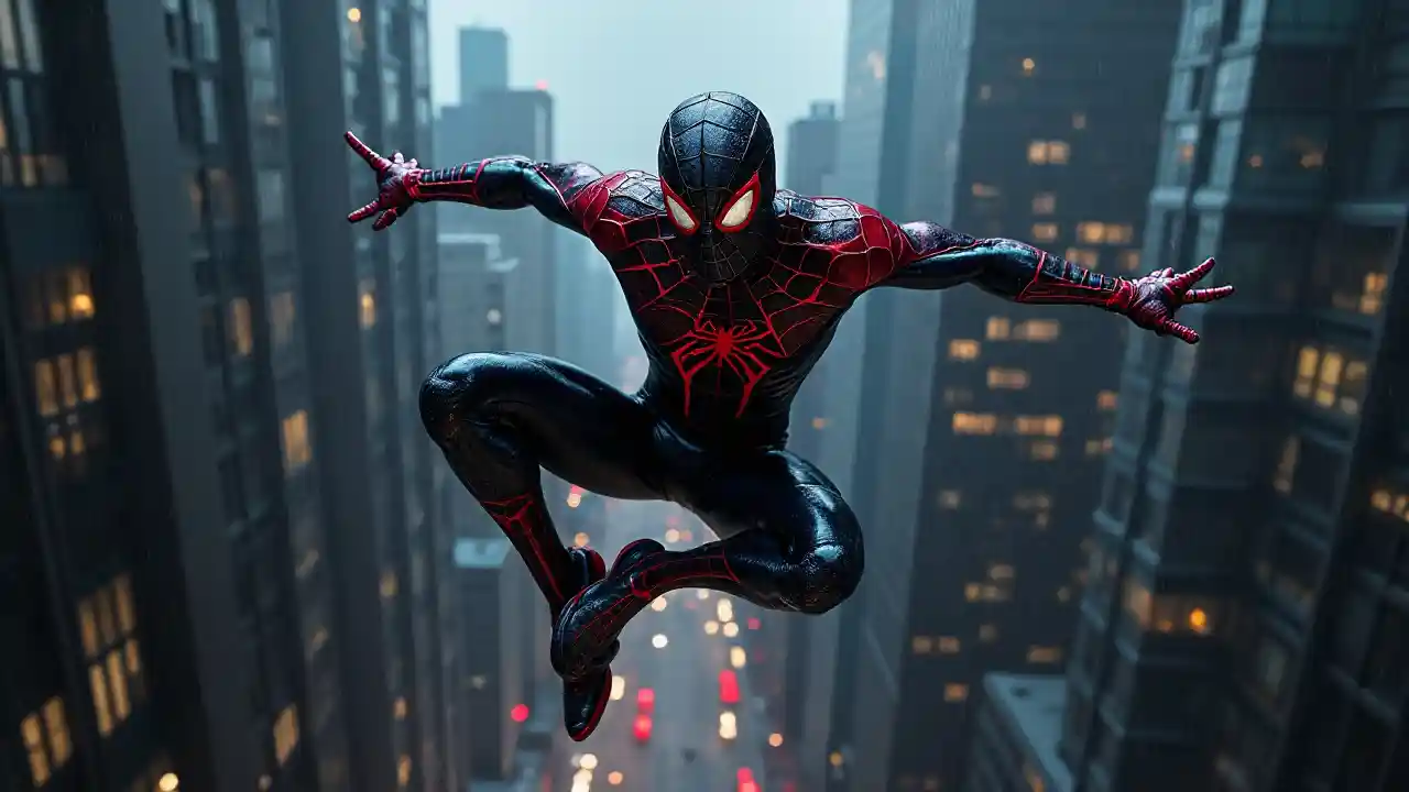 O Homem-Aranha balançando pelos arranha-céus de uma cidade escura e encharcada de chuva, o seu fato uma pele ferrofluída fascinante que reflete tons metálicos nítidos.