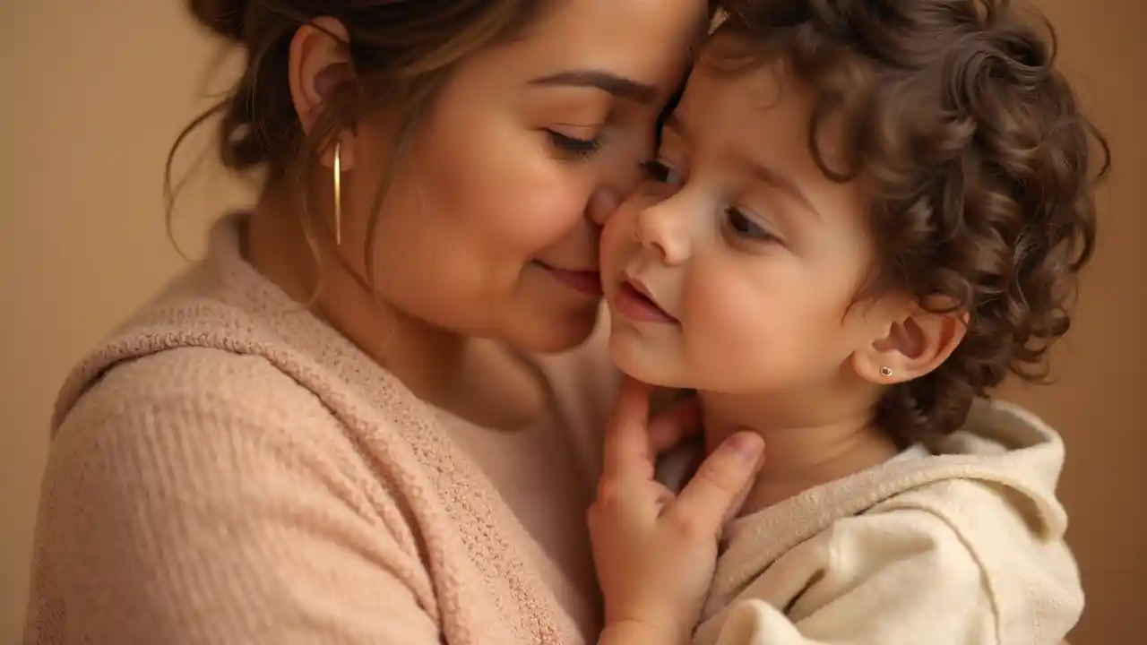 Amoroso "Caleor de Veludo" > Uma mãe tocando suavemente o rosto do filho, olhos cheios de calor. Paleta de cores: Rosado, Creme de Pêssego, Ouro macio, Terra. Humor: Afeto nutrido, seguro e intemporal.
