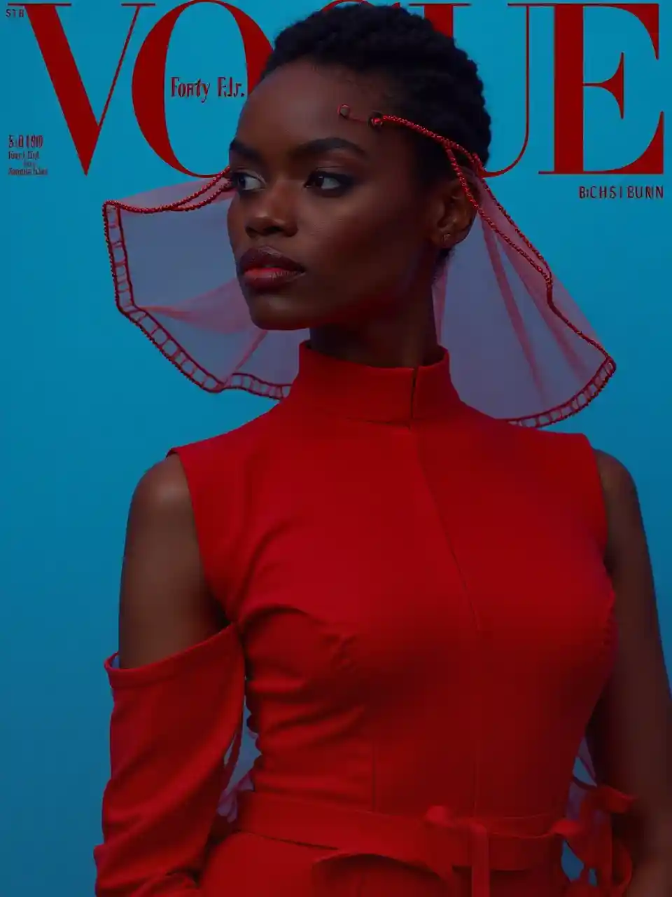 AlexanderCobertura da Vogue, Donyale Luna, vanguarda, simplesmente, fotos espalhadas, vestidas de todo vermelho, fundo azul, Harper bizarro, capa, foto, hiper realista