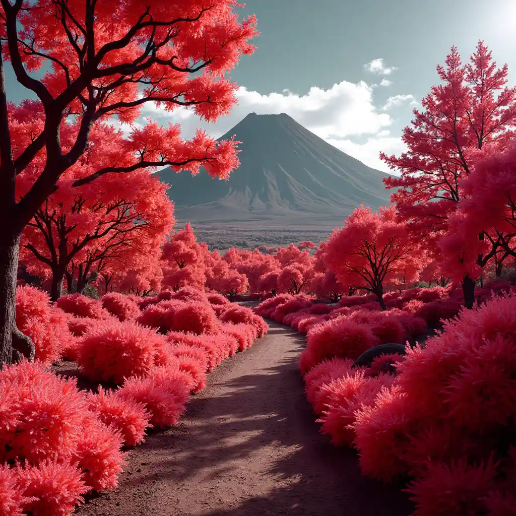 OliverFotografia de paisagem do jardim e árvores do vulcão, capturada usando fotografia infravermelha, imagem de resolução 8k, lisa e polida. cores vermelhas e pretas