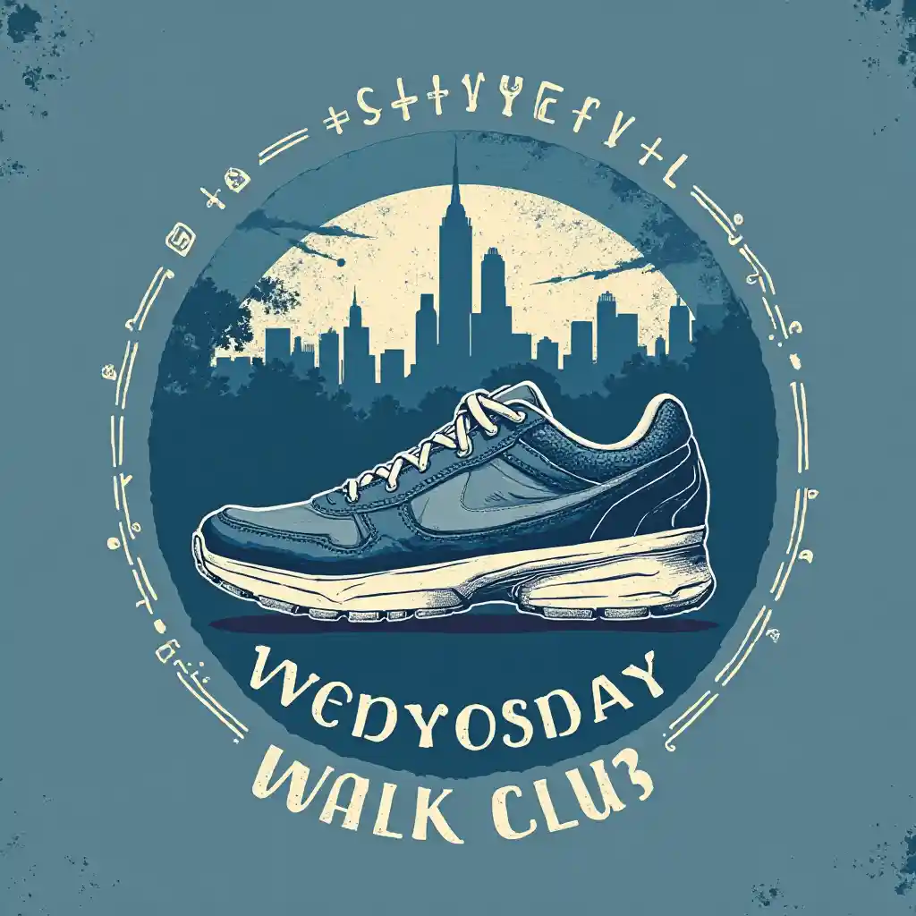 criar um logotipo vintage de camiseta para um clube de caminhada da cidade. o nome do clube é Wednesday Walk Club. deve ter um sapato de desporto no logotipo