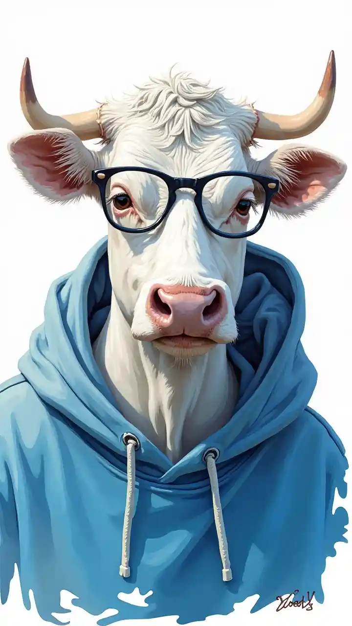 vaca branca,retrato, bluebird, com óculos, vintage, ilustração fotorrealista, vetor, plano, isolado sobre fundo branco, pintura, óleo, natureza morta, botânica, Itália, acrílico, hip hop, estilo de Pierre-Jose Redoute
