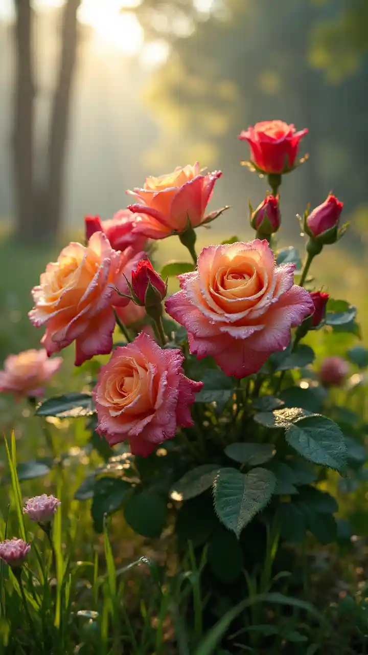 BraydenUm grande buquê de rosas silvestres de uma variedade rica de cores cobertas por gotas de orvalho , descansando na grama numa floresta iluminada . Neblina