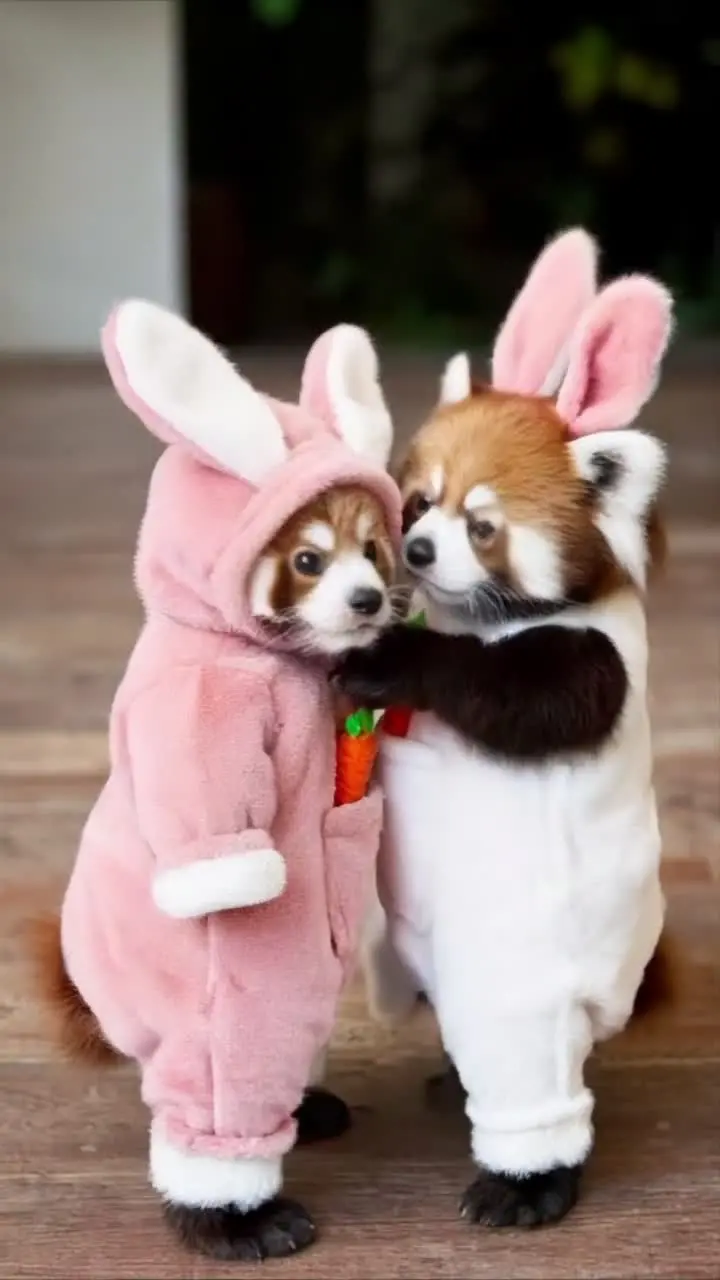 Experimente a alegria dos pandas vermelhos em trajes de coelhos