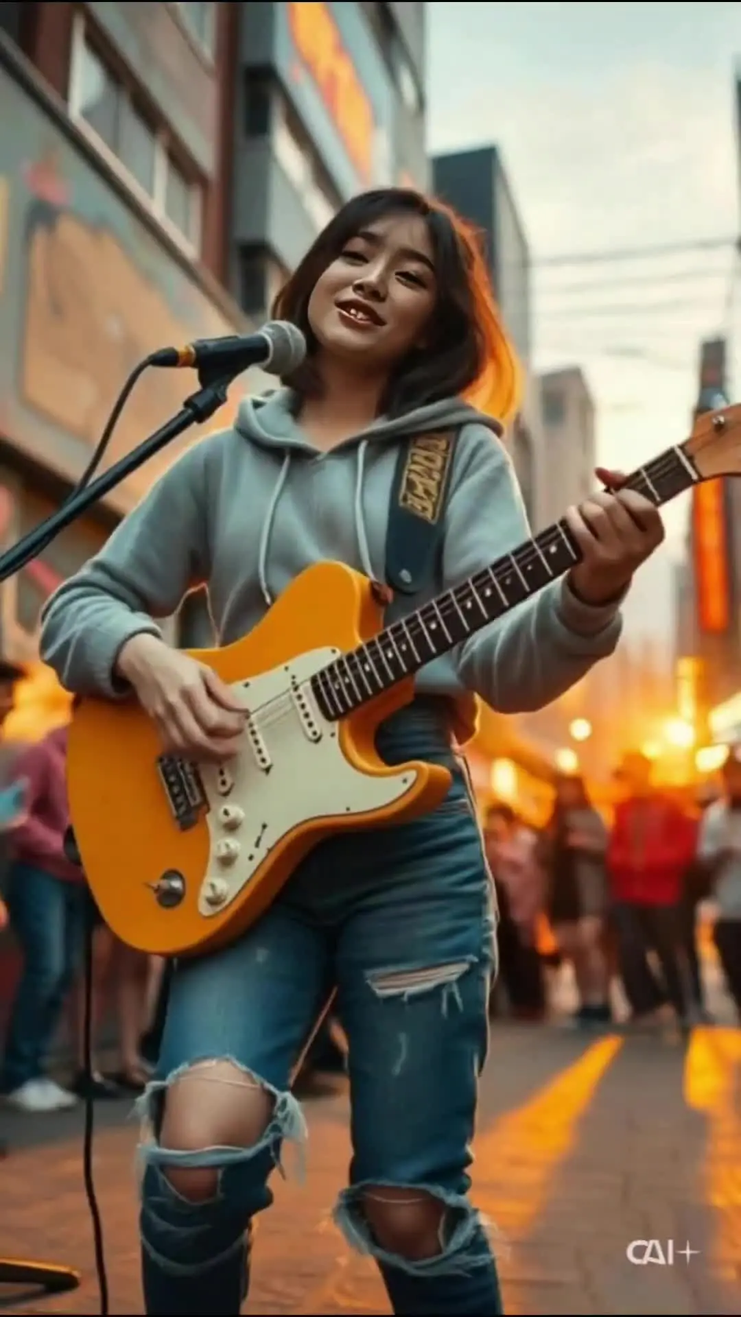 No coração da movimentada cidade, uma jovem de capuz cinza e jeans rasgados dá vida à rua com sua guitarra elétrica. Mas aqui é que fica interessante - graças à IA, ela não está apenas a tocar; ela está a cantar músicas com uma voz que ressoa na multidão! Imaginem seus lábios perfeitamente sincronizados a uma melodia cativante, transformando uma simples apresentação de rua num espetáculo emocionante. Os transeuntes param, cativados pela energia vibrante, enquanto suas letras sinceras parecem saltar de sua boca, misturando-se perfeitamente com a atmosfera urbana. Quer sejam monstros ou animais de estimação, esta tecnologia revolucionária transforma momentos do dia em experiências encantadoras. Prepare-se para sorrisos, surpresas e muita diversão - veja como a realidade se mistura com a imaginação, criando uma performance que você não esquece!