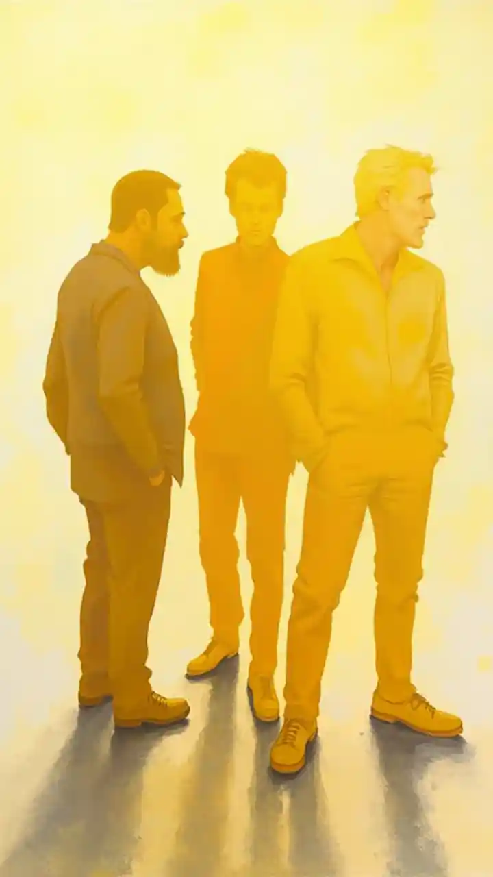 Три человека в вытянутой вертикальной композиции, их фигуры деликатно очерчены ярким желтым цветом, стоящие рядом с легкой абстракцией в глубине и форме, силуэт на мягком градиенте фоне.