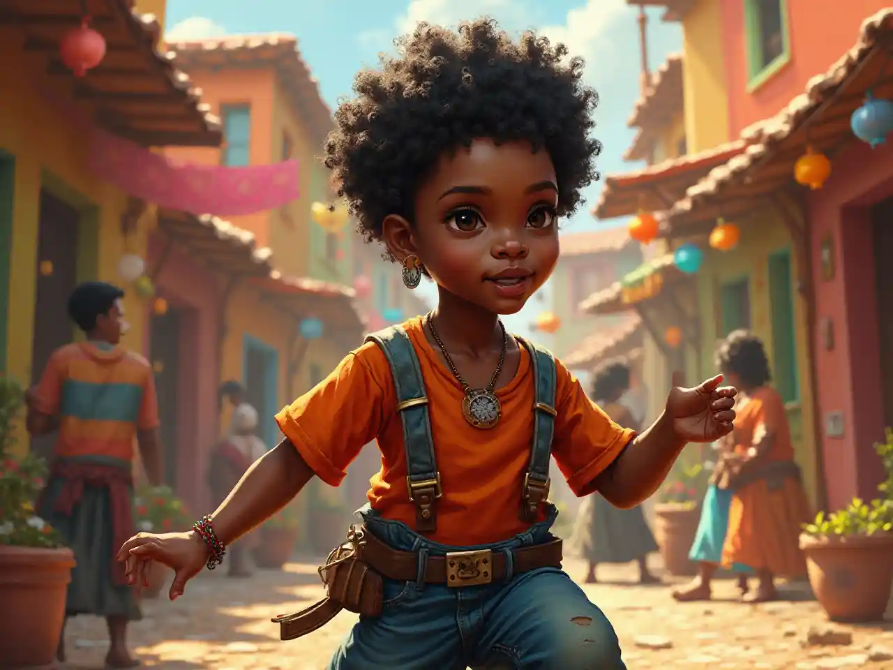 Создайте образ маленького африканского мальчика с темной кожей, одетого в рабочую одежду, танцующего в праздничной обстановке с яркими цветами и в мексиканских декорациях. Стиль должен быть фантастическим, маслом, похожим на произведения искусства, найденные в игре на карты "Магия: Собрание". Не включайте подпись художника или какой-либо текст в изображения.