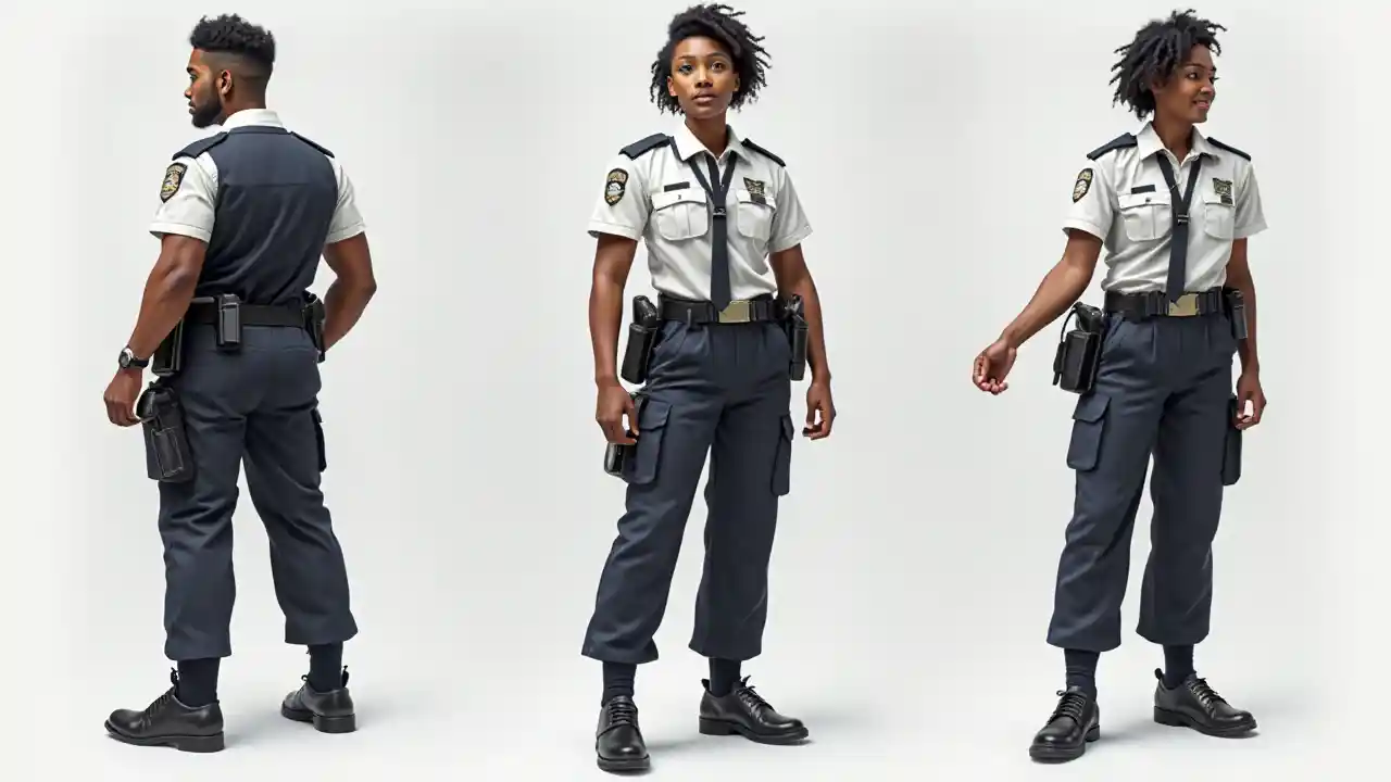 ChloeКрасивый взрослый африканский персонаж в черно-белом полицейском костюме, в позе, разные взгляды, полное тело, обращенное вперед