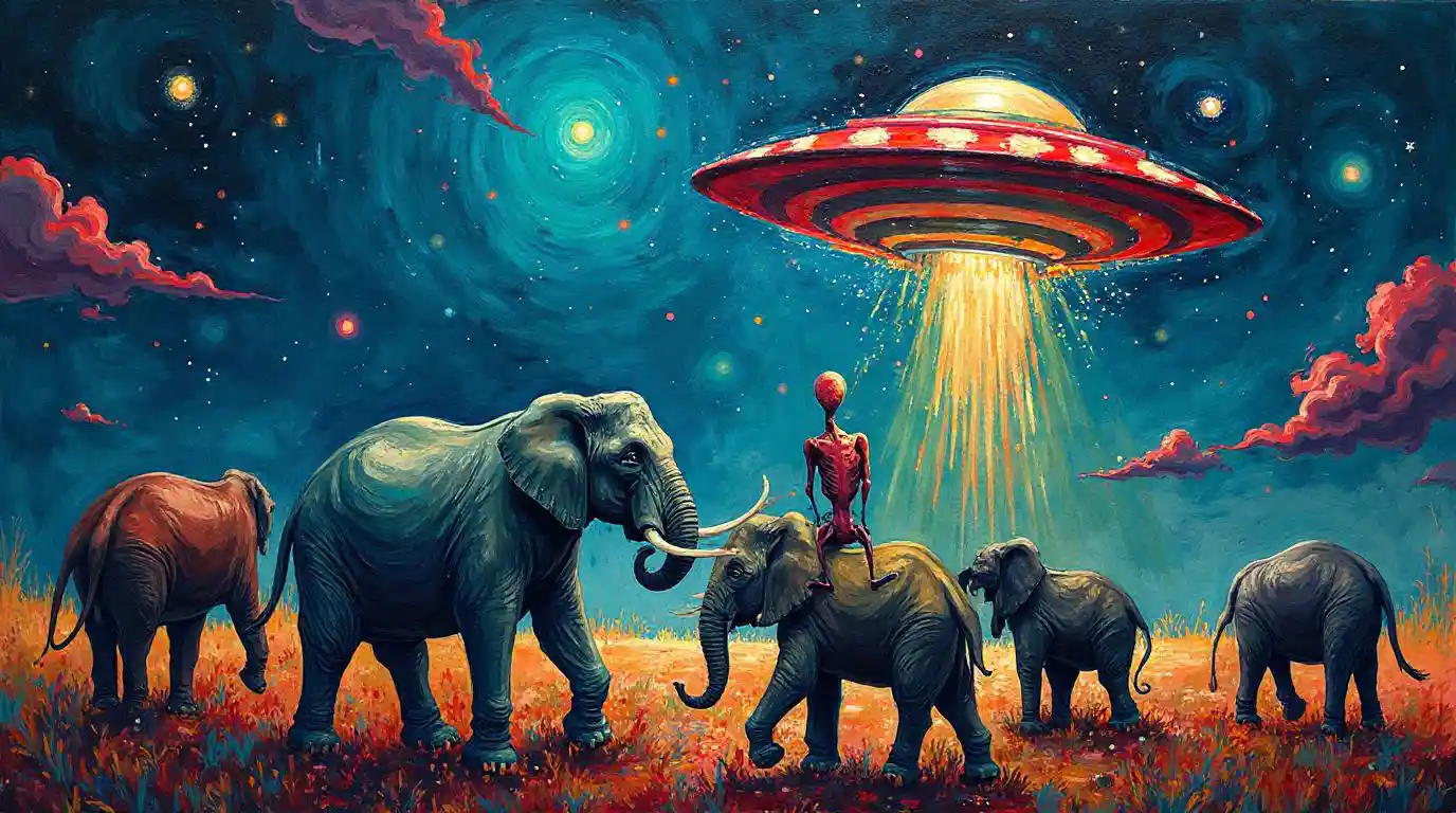 Экспрессивная, абстрактная экспрессионистская интерпретация инопланетян, похищающих слонов под звездочным ночным небом. Слон, изображенный смелыми мазками и яркими цветами, кажется движущимся, когда его поднимает вращающееся, красочное НЛО. На фоне хаотичная смесь синего, огненного красного и яркого неонового, отражающая эмоциональную интенсивность и создающая сонную, сюрреалистическую ощущение. Инопланетяне изображены в преувеличенном, причудливом виде, с жидкими формами, которые, кажется, танцуют вокруг слонов. Эта композиция передает чувство удивления и беспокойства через динамичные формы и контрастные цвета.