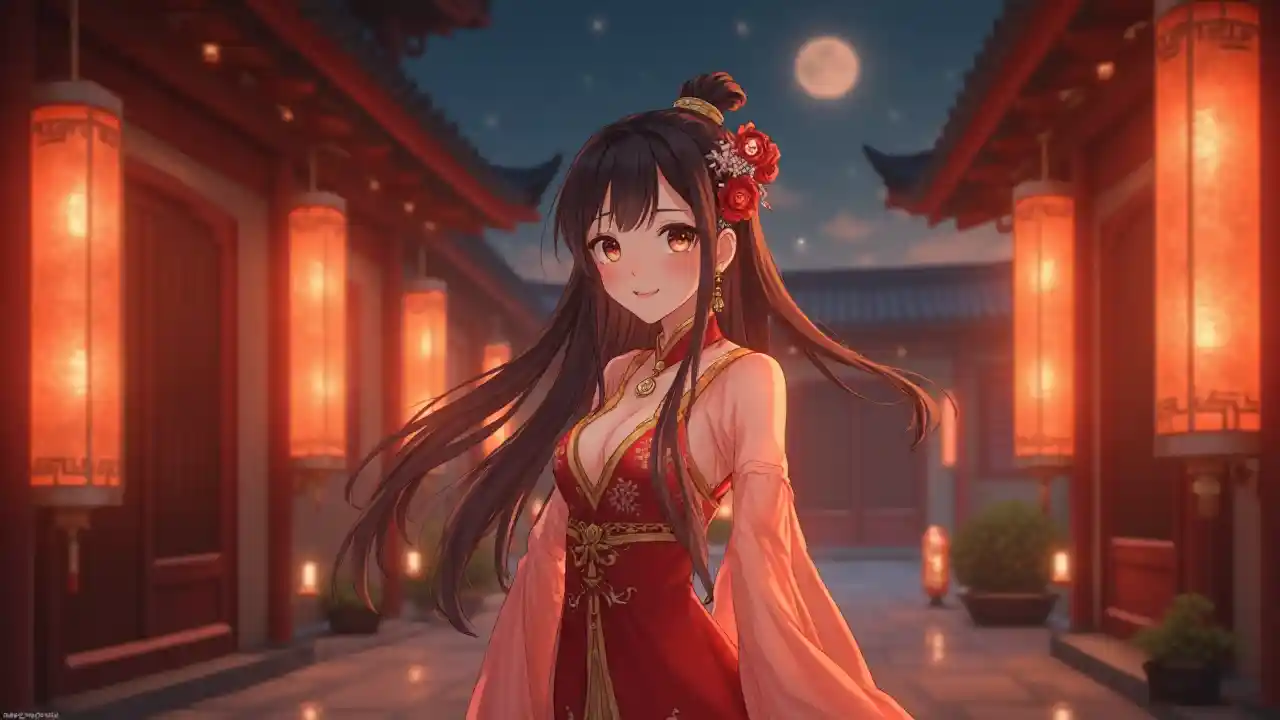 Horizontal large-scale image of an Ultra HD anime girl, breathtakingly beautiful and elegant, illuminated by a lantern’s glow, standing in an indoor traditional Chinese courtyard at night, wearing a revealing hanfu with a deep neckline and sheer sleeves, her long hair adorned with a hair stick and a warm smile, big shimmering eyes, glowing skin, soft red and gold color palette, refined features, flawless makeup, tranquil and romantic vibes, warm lighting with a soft glow, emphasizing her graceful, well-defined chest with a subtle cleavage, and long, toned legs with a poised posture, radiating charm and elegance.