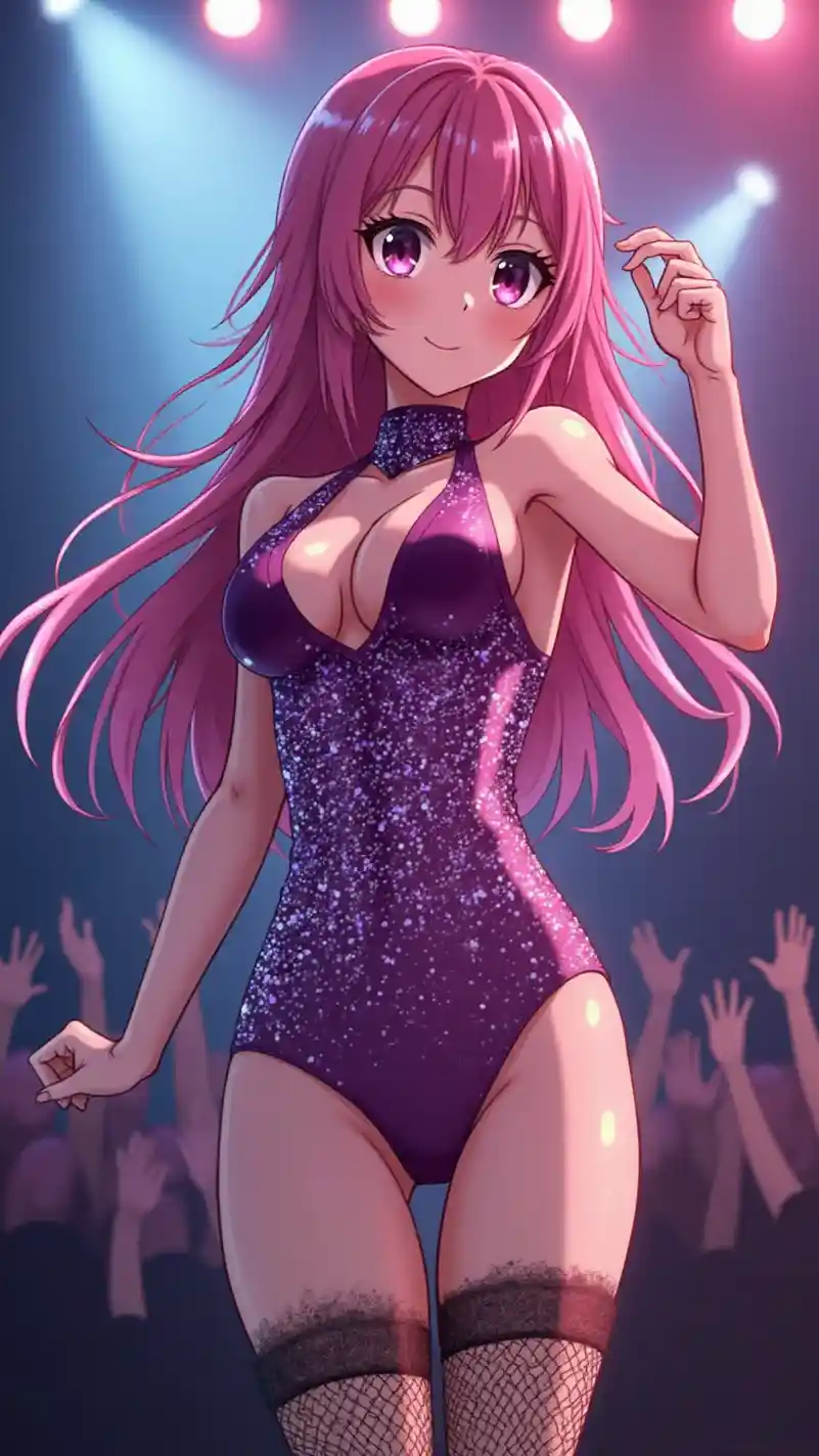 Вертикальное крупномасштабное изображение девушки из аниме Ultra HD, захватывающей красотой и соблазном, освещенной световыми фонарями, стоящей на крытой сцене с толпой, одетой в блестящий костюм с глубоким вырезом шеи и носки из рыбной сети, ее длинные волосы, текущие с ритмом и уверенной улыбкой, большие блестящие глаза, светящаяся кожа, яркая розовая и фиолетовая палитра, изыскаемые черты, смелый макияж, энергичные и гламурные вибрации, тонкое освещение с мягким светом, подчеркивая ее соблазните, хорошо определенных груди с тонким деко, и длинные, позирующие ноги с динамичным то, излучает харизм и все.