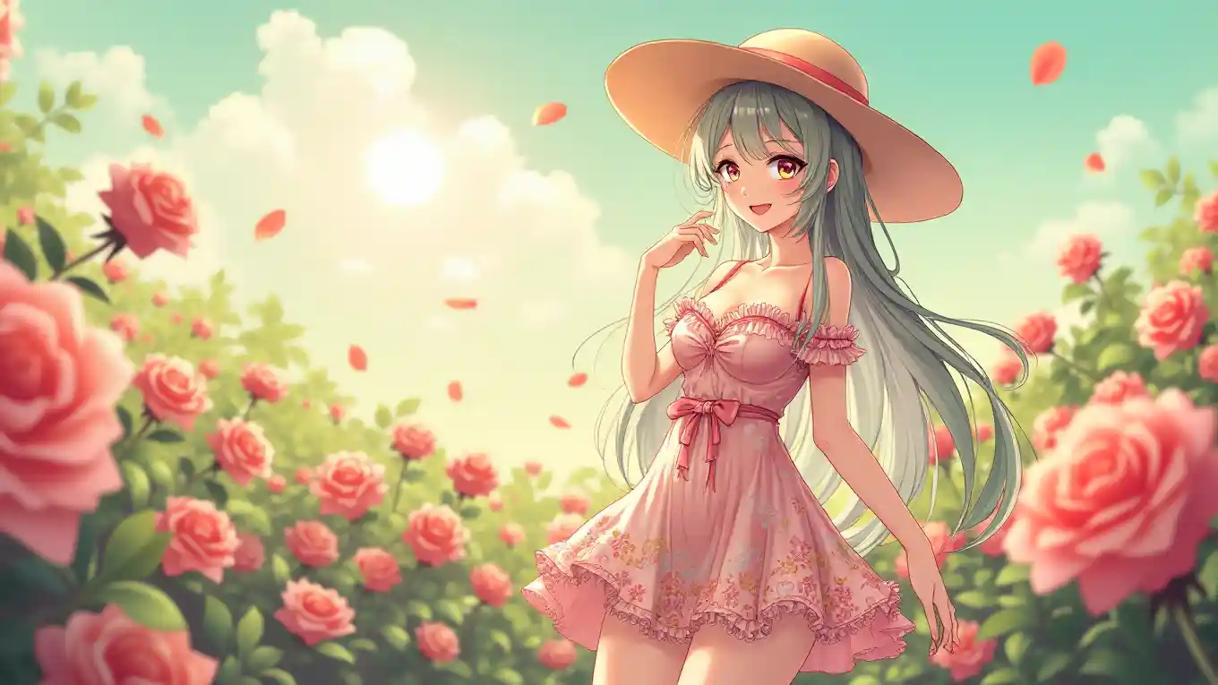 Горизонтальное изображение в большом масштабе девушки из аниме Ultra HD, захватывающей красотой и соблазном, греющей на утреннем солнце, стоящей в ярком розовом саду на открытом воздухе, одетая в цветочный гардероб с углубленным декольтом и с широкой крышей, ее длинные волосы украшены лепестками роз и сияющая улыбка, широкая блестящая кожа, мягкая розовая и зеленая палитра цветов, изысканные черты, идеальный макияж, романтические и веселые вибрации, мягкое свечение и естественное освещение, подчеркивая ее соблазнитель, хорошо определенных груди с тонким деко, и тонкие, с изображением грацио но но ноги, излучающие красо и оча.