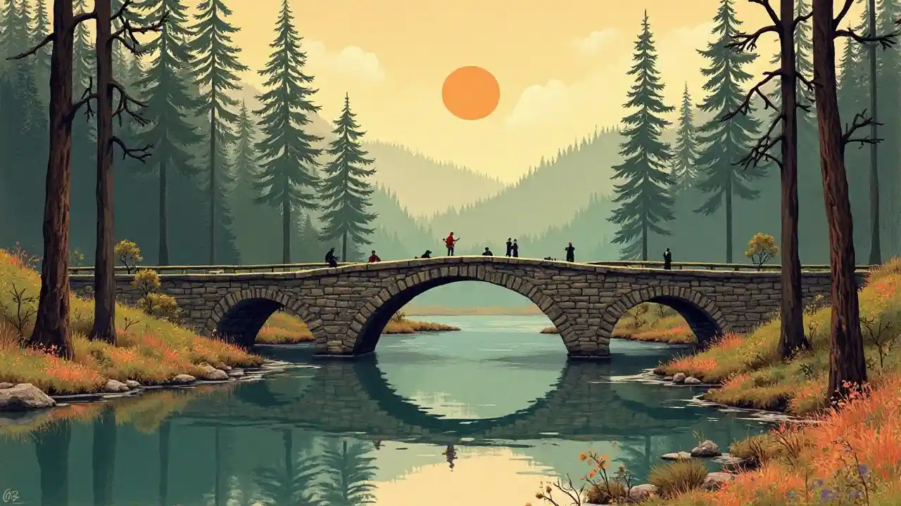 (Антони, с его дикими красными волосами: 9), выпускает обручок удовольствия и кричит: "Положи наркоту через мостик, просто сделай это" Мы наблюдали, как он медленно плыл вниз по долине сосновых деревьев. Это дерьмо продолжалось, пока сумасшедший водитель не оставил нас прямо за Бринмором. Мы поехали на автобусе вниз по долине в Шестерку, где были самые дешевые наркотики и сырой сидр. В своей крошечной комнате он вытащил свиток с полки (длинный сложный свиток японского пейзажа, красиво нарисованный цветным чернилом:1.9). А там, посередине, был мост и лес, где мы разбросали наше сокровищем.