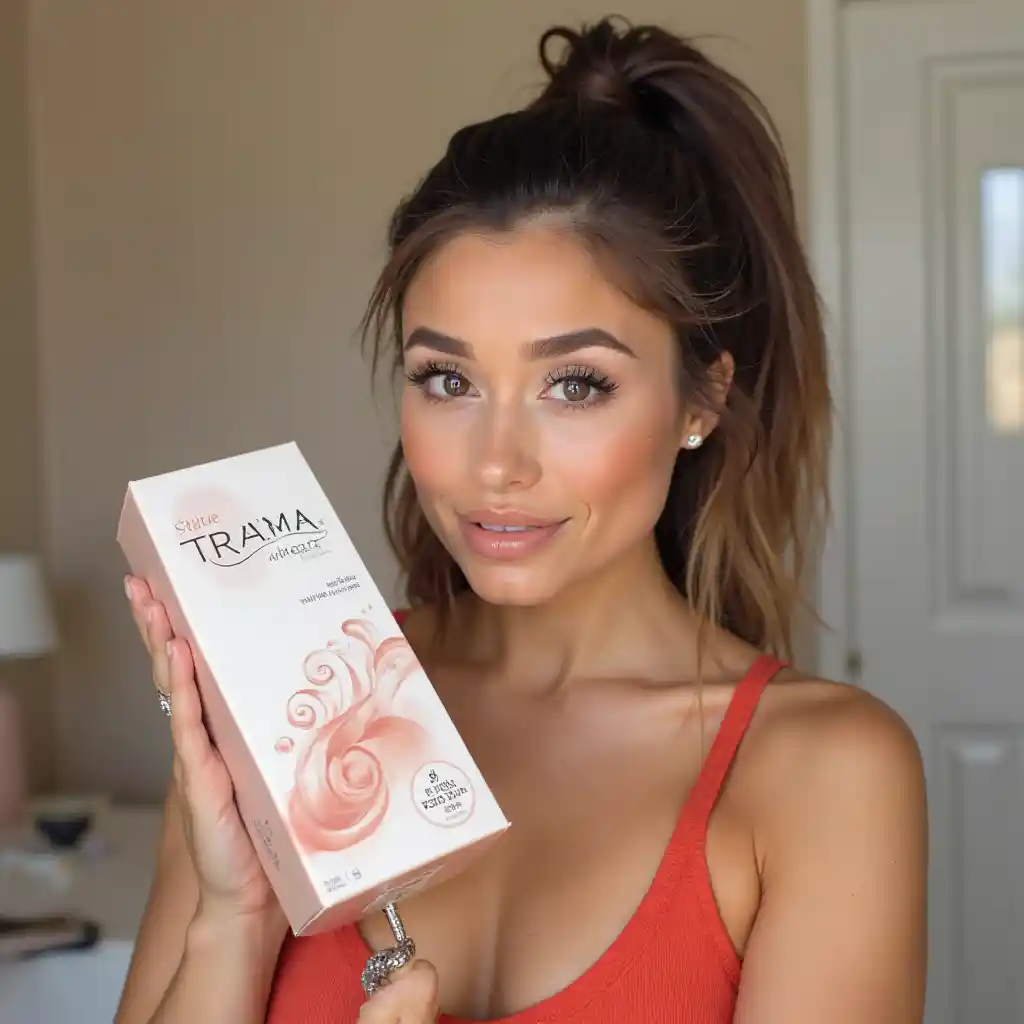 JamesЖенщина, похожая на Ариану Гранде, держит коробку для ухода за кожей.