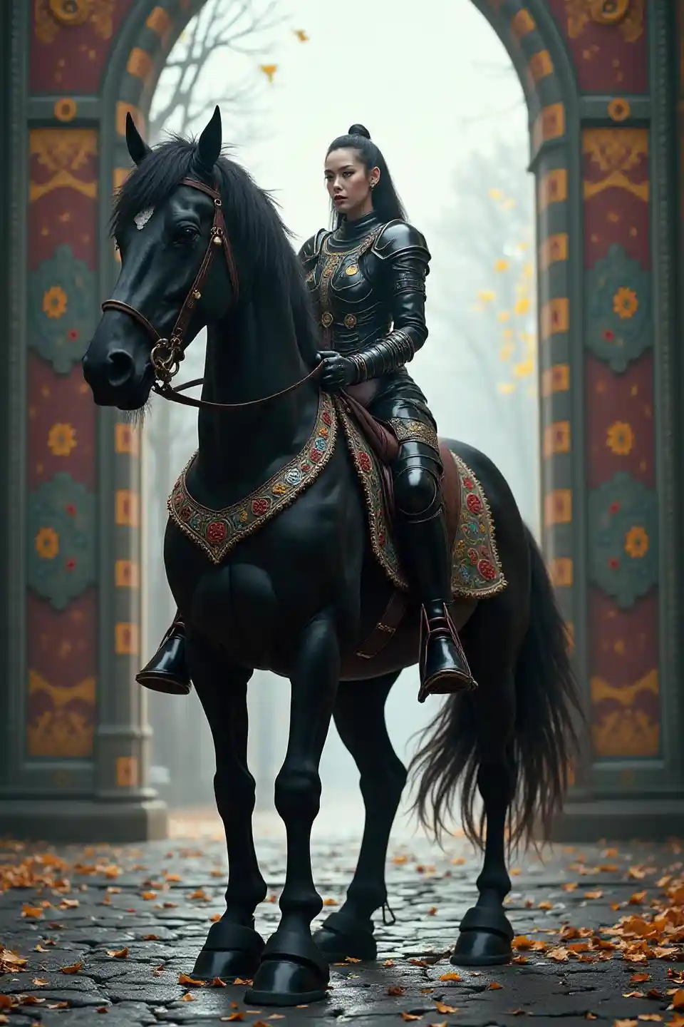 Она едет на огромном черном коне, черная броня выглядит с цветными узорами, пейзаж с огромными цветными воротами, реалистичный, 4K, HD, профессиональный уровень деталей, фотореалистичный