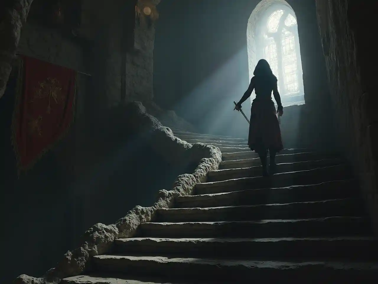 Таинственная девушка в капюшоне спускается по лестнице древнего замка