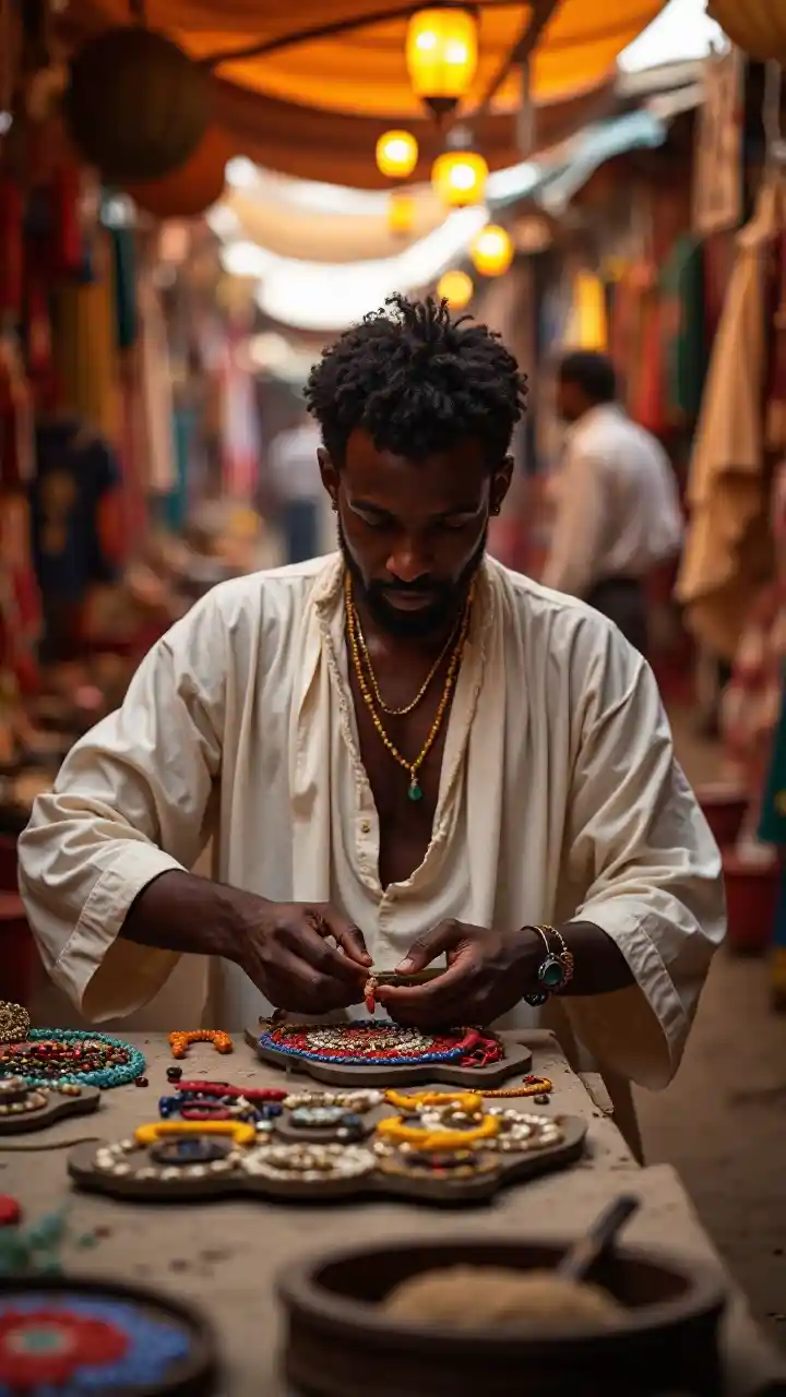 Сделанный ювелирным изделием на пустынном рынке, черный мужчина в 25 лет светит в свободную тунику. Красочные стойки и фонарики обрамляют его, его умелые руки и спокойное внимание излучают ремесленную страсть и живое очарование в оживленном экзотическом окружении.