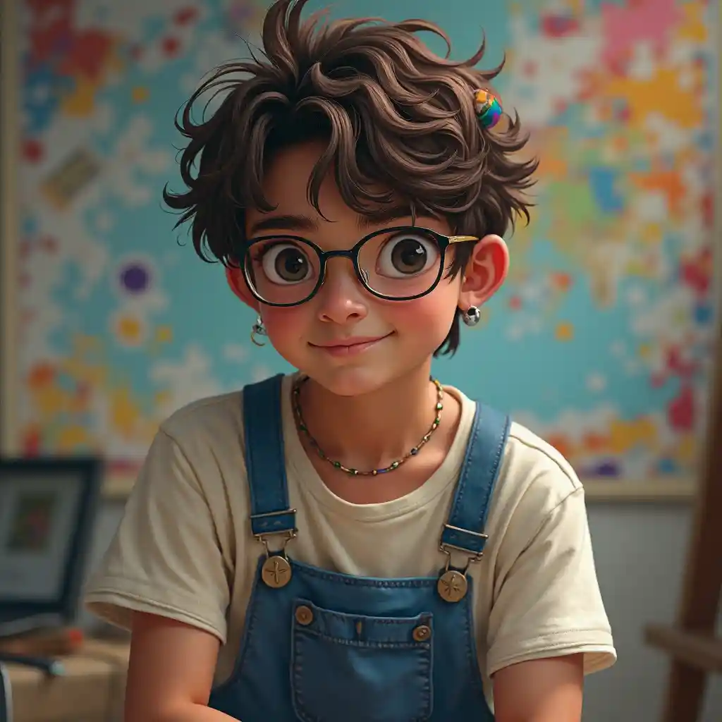 1 человек, соло, сосредоточиться на мужчине, андрогинный, женственный, тонкий тело, студент коллажа, с капюшоном, карие волосы, короткие волосы, волнистые волосы, беспорядочные клипы, черные глаза, очки, темная кожа, коричневая кожа, улыбка, милый, обрезанная рубашка, голубые комбинезоны, радужные браслеты, блеск, пятна краски, (фон студии), днем, частицы пыли, очень детально, позируют для картины, выглядит дружественным, вблизи, сосредоточиться на лице, вблизи, псевдореализм, шедевр, лучший качество, удивительный качество, очень эстетичный, абсурдный, (объемный освещение, пейза), смот на зрителей, завар