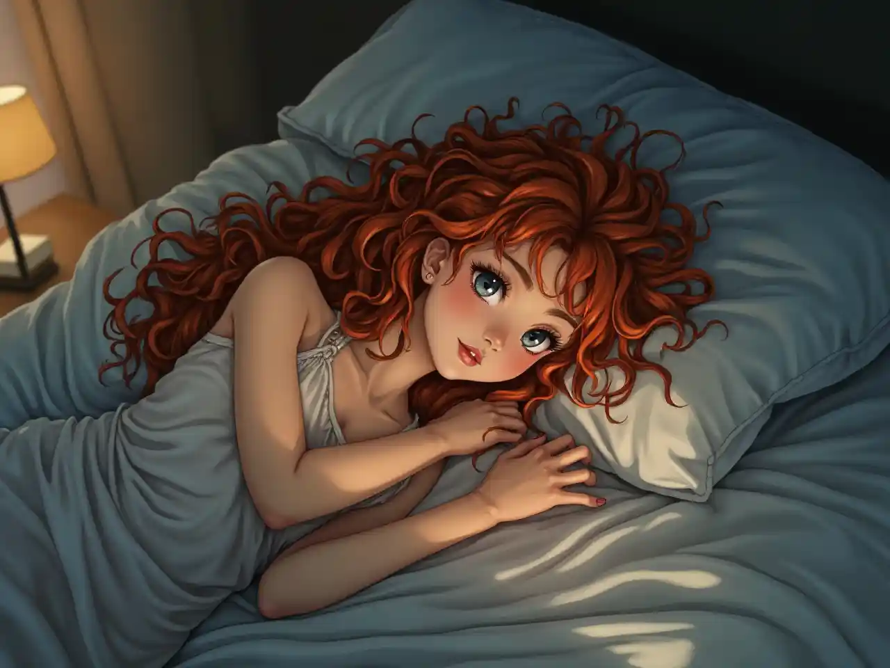 HarrisonФотореалистическая масляная картина из студии невероятно милая 20-летняя Асука Лэнгли Сорю с длинными локотью рыжими волосами, одетой в шелковые ночные платья, лежащие на кровати в больших размерах