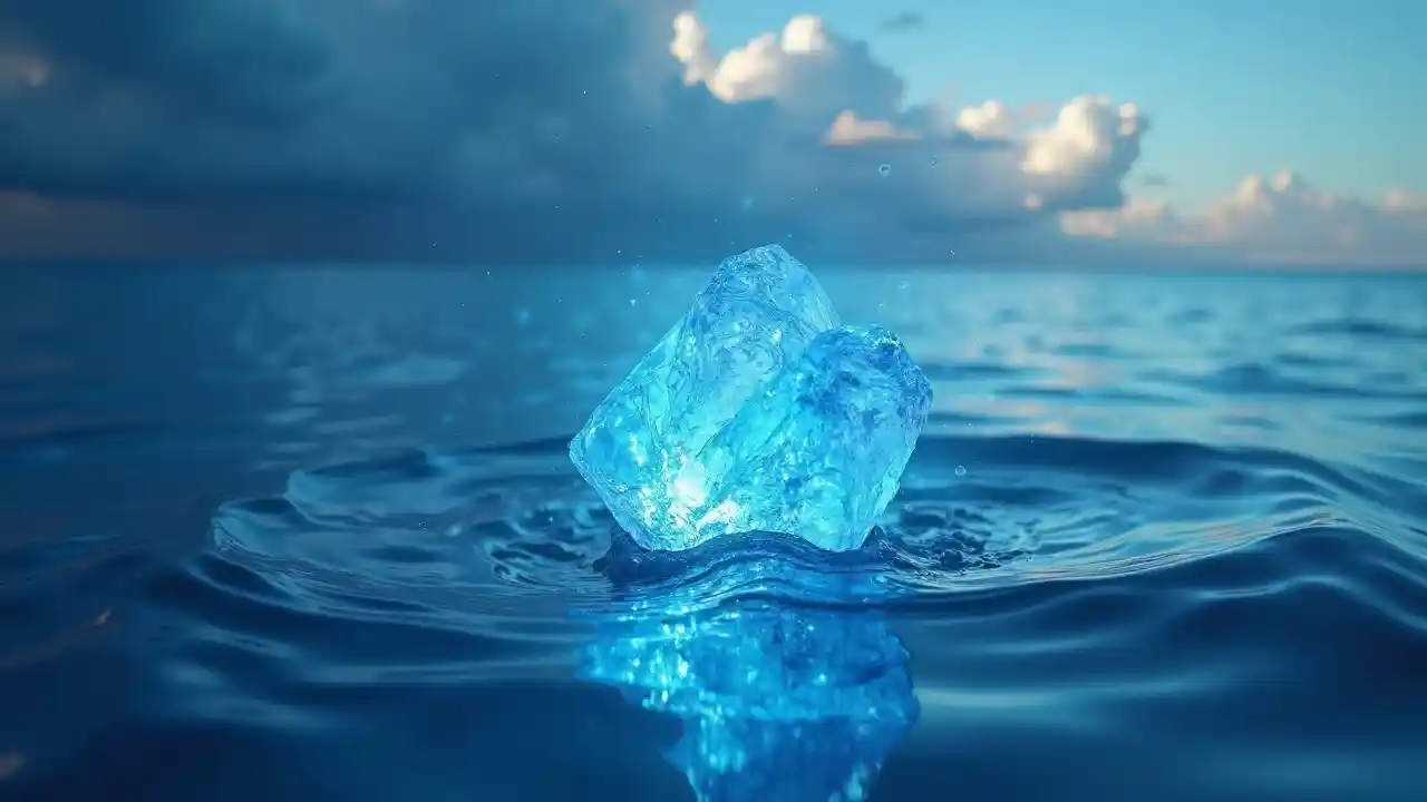 Волшебный синий кристалл, летящий на дюйм выше воды, океан, просто горизонт и вода на фоне