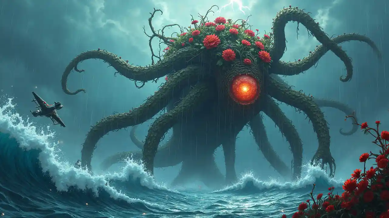 Нарисуйте гигантскую гидру из колючих растений и извилистых колючих лоз с красными фимбриатами далиями вокруг каждой головы и с группой красных фимбриатами далиями у основания шеи, с гигантским красно-оранжевым гладким полусферным энергетическим ядром в середине груди под основанием шеи и под решеткой маленьких тонких лоз, дайте ему две передние, которые заканчиваются корнями для ног. Нарисуйте гидру, сражающуюся с летающим научно-фантастическим боевым кораблем, который стоит в океане во время сильного шторма с большими волнами и дождем и молниями, дующими в небе и, и, и, и, и, и, и, и, и, и, и, и, и, и, и, и, и, и, и У вас есть лозы, заканчивающиеся зубчатыми ртами, растущими из моря, и у вас есть дрон, который одна из голов гидры уничтожает взрывом энергии из его рта. Это должно быть ботаническое действие кайджу. Рисуйте в гипер-детальном полуреалистическом, слегка вдохновленном аниме, 2D-рисуемом стиле концепта. → сделать его четырехногой гидрой с несколькими головами