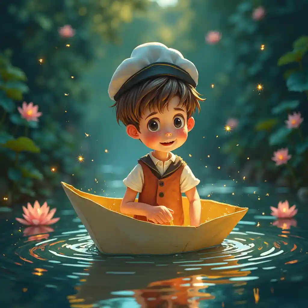 7-летний белый мальчик с веснушками плывет на бумажной лодке в свете реки, одетый в матросскую шляпу и жилет. Светожилы и цветы лотоса обрамляют его, его нежные толчки излучают любопытство и спокойное приключение в мечтательной природе.