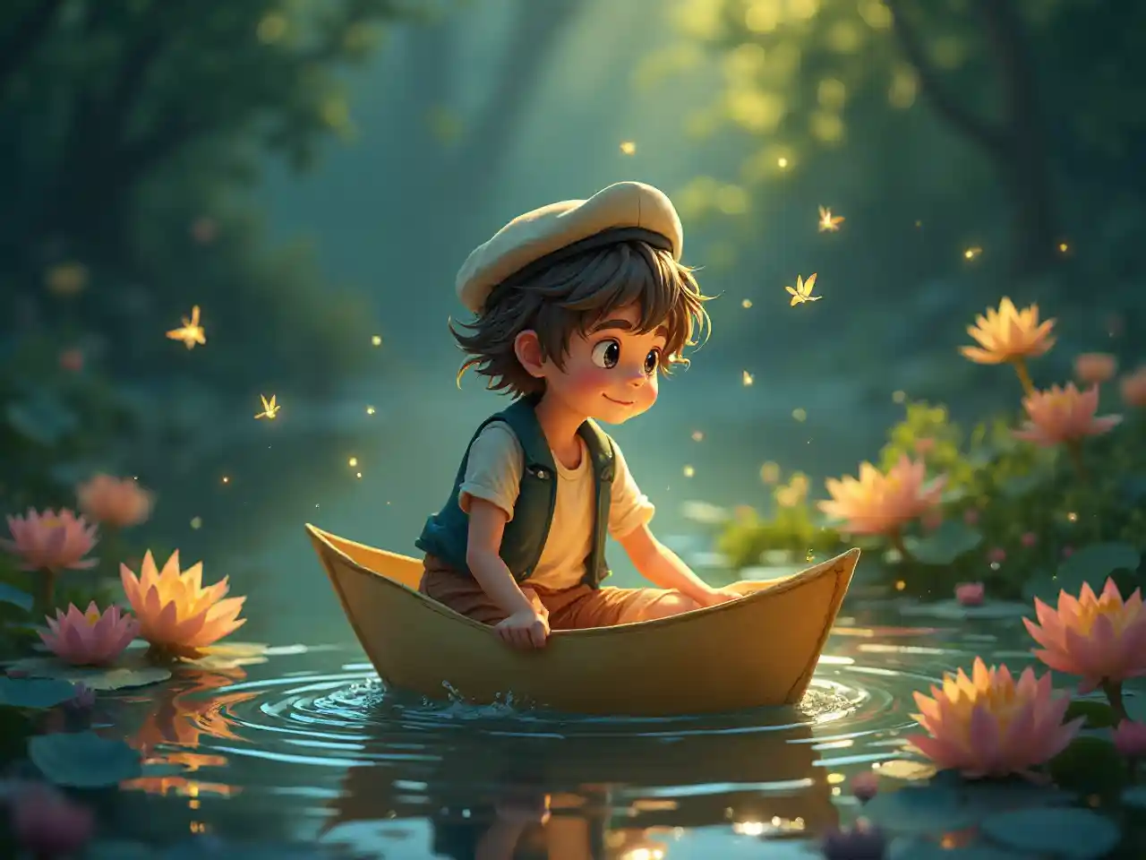 7-летний белый мальчик с беспорядочными волосами, плавающий на бумажной лодке в свете реки, носит матросскую шляпу и жилет. Светильники и цветы лотоса обрамляют его, его нежные толчки излучают любопытство и спокойное приключение в мечтательной природе.