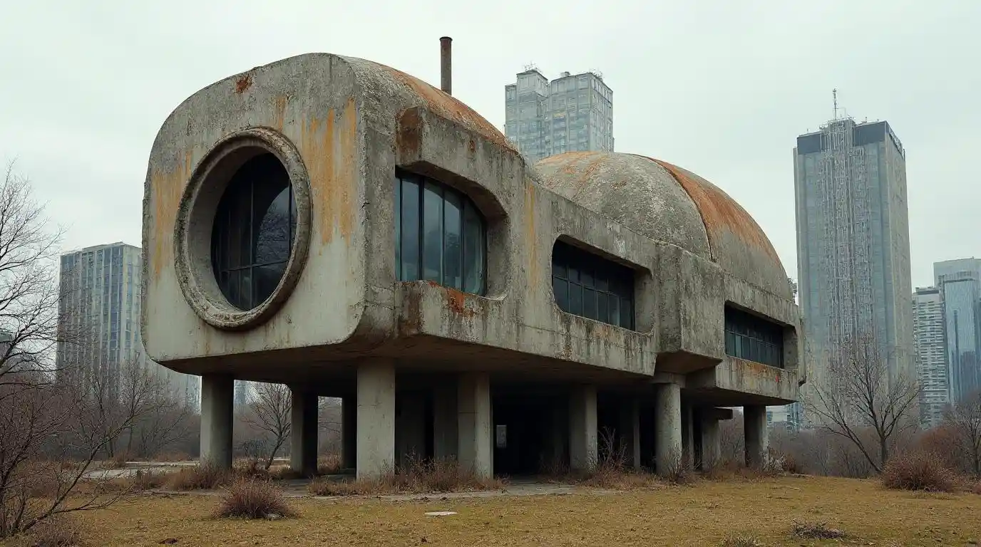 Фото старинного, заброшенного, ржавого бетонного здания в стиле Бауса. Здание имеет инопланетную структуру с большим круглым окном. На заднем плане город с высокими современными зданиями. Фото имеет сюрреалистическое, сонное качество.