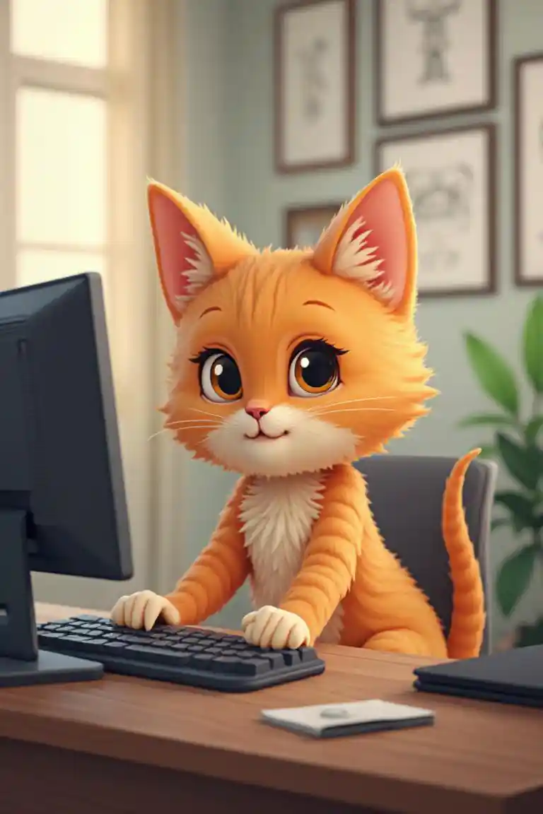 Peytonсцена, где милая оранжевая кошка работает новой сотрудницей. В маленьком офисе. Кошка сидит за своим столом и использует компьютер