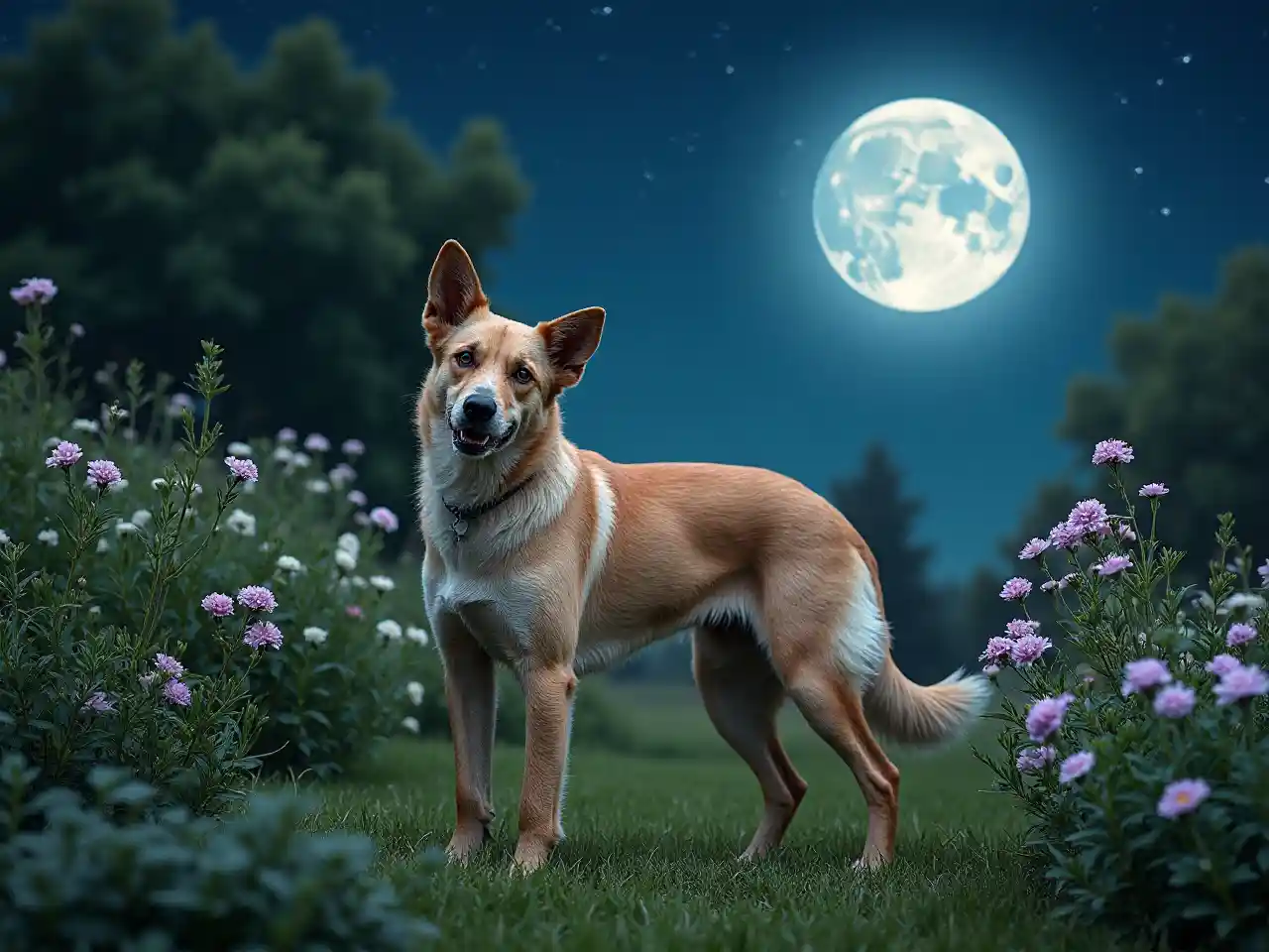 Яркая весенняя ночь для очаровательной собаки под луной