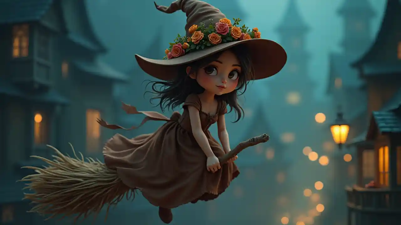 очаровательная таинственная и жуткая атмосфера где главный герой будет женщина - ведьма она носит коричневую шляпу с цветами. У неё довольно милое, тонкое лицо и прекрасная внешность. Понятно, что она молодая и красивая. Она летает на метле в коричневом платье с луком. вокруг ночного города немного сфинга и блеска не повредит для искрящейся атмосферы метло должно вписываться в раму и быть как подробно, высокое качество и хорошо спроектированы как можно больше