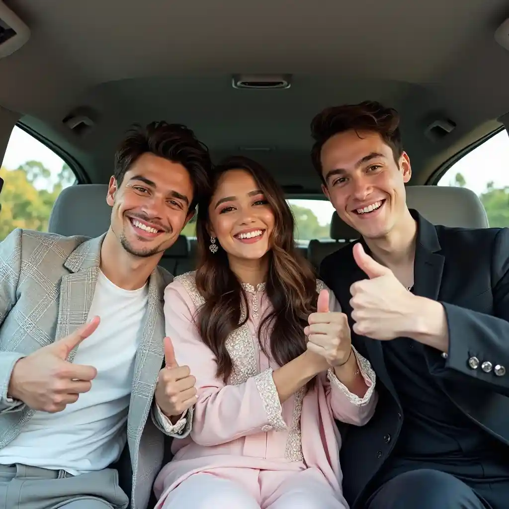 Веселая троица позирует внутри автомобиля, демонстрируя живое товарищество в спокойной обстановке. Слева мужчина в светло-сером блейзе с чемодановым рисунком поднимает большой палец, его выражение уверенно и привлекательно. Рядом с ним стоит женщина в пастельно-розовом традиционном наряде с дружественной улыбкой, ее длинные волосы падают вниз, и она игриво смотрит в камеру. Справа другой молодой человек в ярком черном костюме отражает оптимистичное настроение, также поднимая палец, но при этом сохраняя стильное поведение. Внутренний отдел хорошо освещен, что отражает спокойную атмосферу на открытом воздухе, что говорит о восхитительной поездки, наполненной смехом и связью между друзьями.