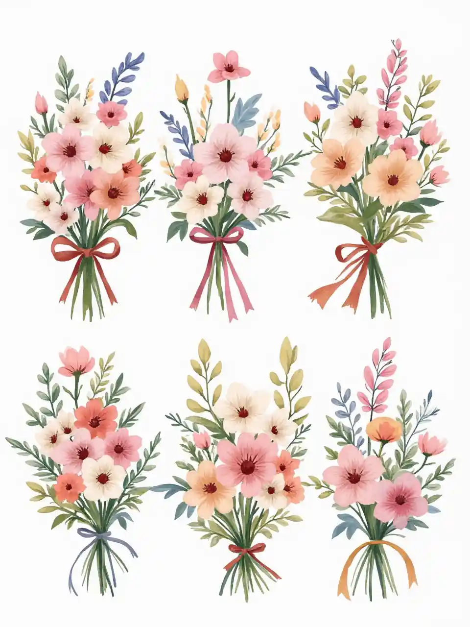 Очаровательный акварельный рисунок в стиле Чиби с очаровательными букетами цветов. Букеты заполнены разноцветными и причудливыми цветами, каждый из которых имеет свое уникальное очарование. Цветы изображены в мягких пастельных оттенках, что придает дизайну прикосновения. Фон чистый и белый, чтобы цветы сияли