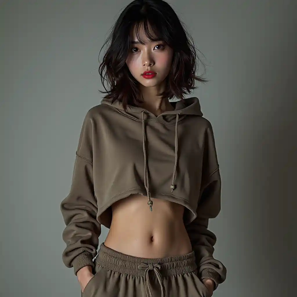Потрясающая корейская девушка с шикарной ложной причёской, одетая в стильный капуст и трусы капри. Ее руки небрежно зажаты в карманах, выделяются ее красные губы и тонированный живот. Ее тонкие маленькие груди дополняют ее элегантный внешний вид, подчеркиваемый длинными ресницами и эгио салом под драматическим освещением, захватывающим суть современной фотографии.